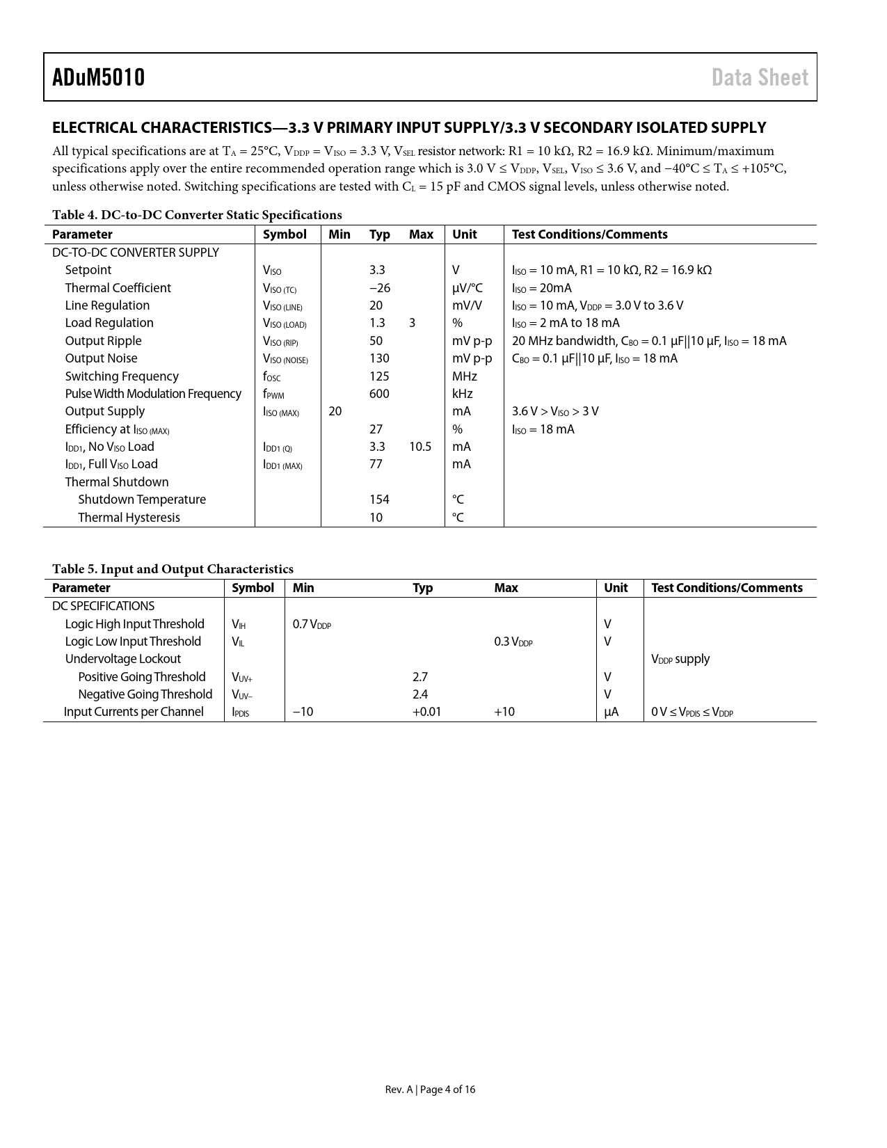 ADuM5010Data SheetELECTRICAL CHARACTERISTICS—3.3 V PRIMARY INPUT SUPPLY/3.3 V SECONDARY ISOLATED SUPPLY All typical specifications are at TA = 25°C, VDDP = VISO = 3.3 V, VSEL resistor network: R1 = 10 kΩ, R2 = 16.9 kΩ. Minimum/maximum specifications apply over the entire recommended operation range which is 3.0 V ≤ VDDP, VSEL, VISO ≤ 3.6 V, and −40°C ≤ TA ≤ +105°C, unless otherwise noted. Switching specifications are tested with CL = 15 pF and CMOS signal levels, unless otherwise noted. Table 4. DC-to-DC Converter Static Specifications ParameterSymbolMinTypMaxUnitTest Conditions/Comments DC-TO-DC CONVERTER SUPPLY Setpoint VISO 3.3 V IISO = 10 mA, R1 = 10 kΩ, R2 = 16.9 kΩ Thermal Coefficient VISO (TC) −26 μV/°C IISO = 20mA Line Regulation VISO (LINE) 20 mV/V IISO = 10 mA, VDDP = 3.0 V to 3.6 V Load Regulation VISO (LOAD) 1.3 3 % IISO = 2 mA to 18 mA Output Ripple VISO (RIP) 50 mV p-p 20 MHz bandwidth, CBO = 0.1 µF||10 µF, IISO = 18 mA Output Noise VISO (NOISE) 130 mV p-p CBO = 0.1 µF||10 µF, IISO = 18 mA Switching Frequency fOSC 125 MHz Pulse Width Modulation Frequency fPWM 600 kHz Output Supply IISO (MAX) 20 mA 3.6 V > VISO > 3 V Efficiency at IISO (MAX) 27 % IISO = 18 mA IDD1, No VISO Load IDD1 (Q) 3.3 10.5 mA IDD1, Full VISO Load IDD1 (MAX) 77 mA Thermal Shutdown Shutdown Temperature 154 °C Thermal Hysteresis 10 °C Table 5. Input and Output Characteristics ParameterSymbolMinTypMaxUnitTest Conditions/Comments DC SPECIFICATIONS Logic High Input Threshold VIH 0.7 VDDP V Logic Low Input Threshold VIL 0.3 VDDP V Undervoltage Lockout VDDP supply Positive Going Threshold VUV+ 2.7 V Negative Going Threshold VUV− 2.4 V Input Currents per Channel IPDIS −10 +0.01 +10 µA 0 V ≤ VPDIS ≤ VDDP Rev. A | Page 4 of 16 Document Outline Features Applications General Description Functional Block Diagram Revision History Specifications Electrical Characteristics—5 V Primary Input Supply/5 V Secondary Isolated Supply Electrical Characteristics—3.3 V Primary Input Supply/3.3 V Secondary Isolated Supply Electrical Characteristics—5 V Primary Input Supply/3.3 V Secondary Isolated Supply Package Characteristics Regulatory Approvals Insulation and Safety-Related Specifications DIN V VDE V 0884-10 (VDE V 0884-10) Insulation Characteristics Recommended Operating Conditions Absolute Maximum Ratings ESD Caution Pin Configuration and Function Descriptions Truth Table Typical Performance Characteristics Applications Information PCB Layout Thermal Analysis EMI Considerations Insulation Lifetime Outline Dimensions Ordering Guide