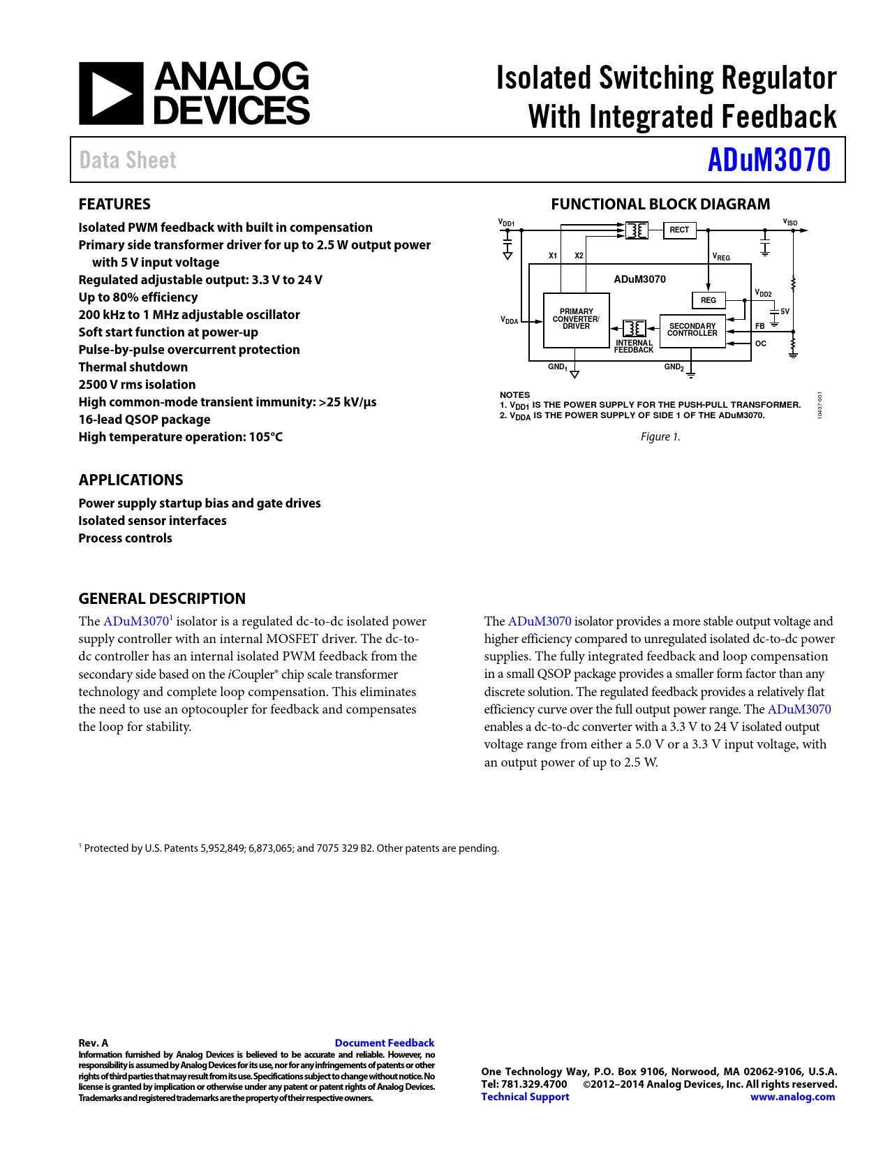 Isolated Switching Regulator. With Integrated Feedback. Data Sheet. ADuM3070. FEATURES. FUNCTIONAL BLOCK DIAGRAM