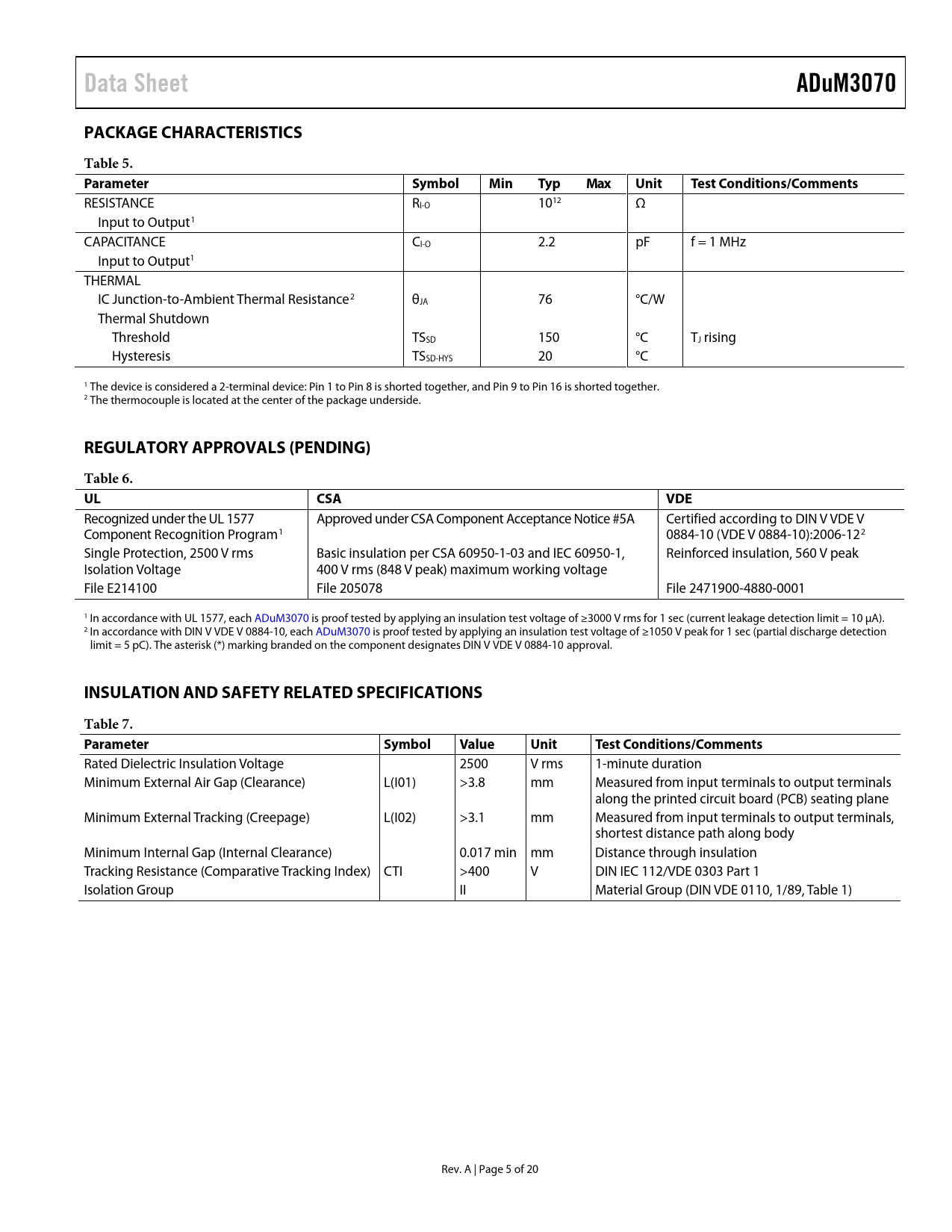 页数 / 页20 / 5 — Data Sheet. ADuM3070. PACKAGE CHARACTERISTICS. Table 5. Parameter. …