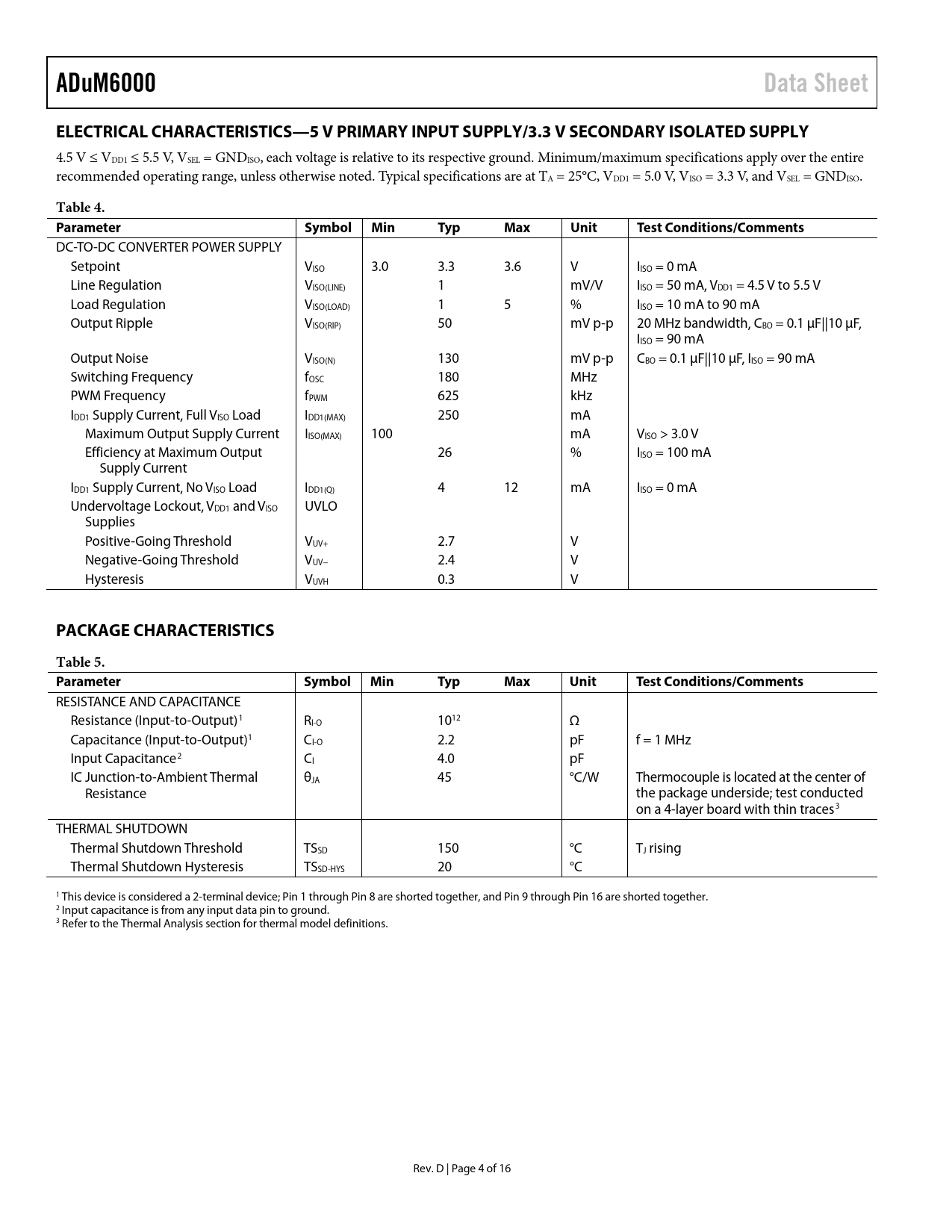 ADuM6000 Data Sheet ELECTRICAL CHARACTERISTICS—5 V PRIMARY INPUT SUPPLY/3.3 V SECONDARY ISOLATED SUPPLY Table 4 Parameter