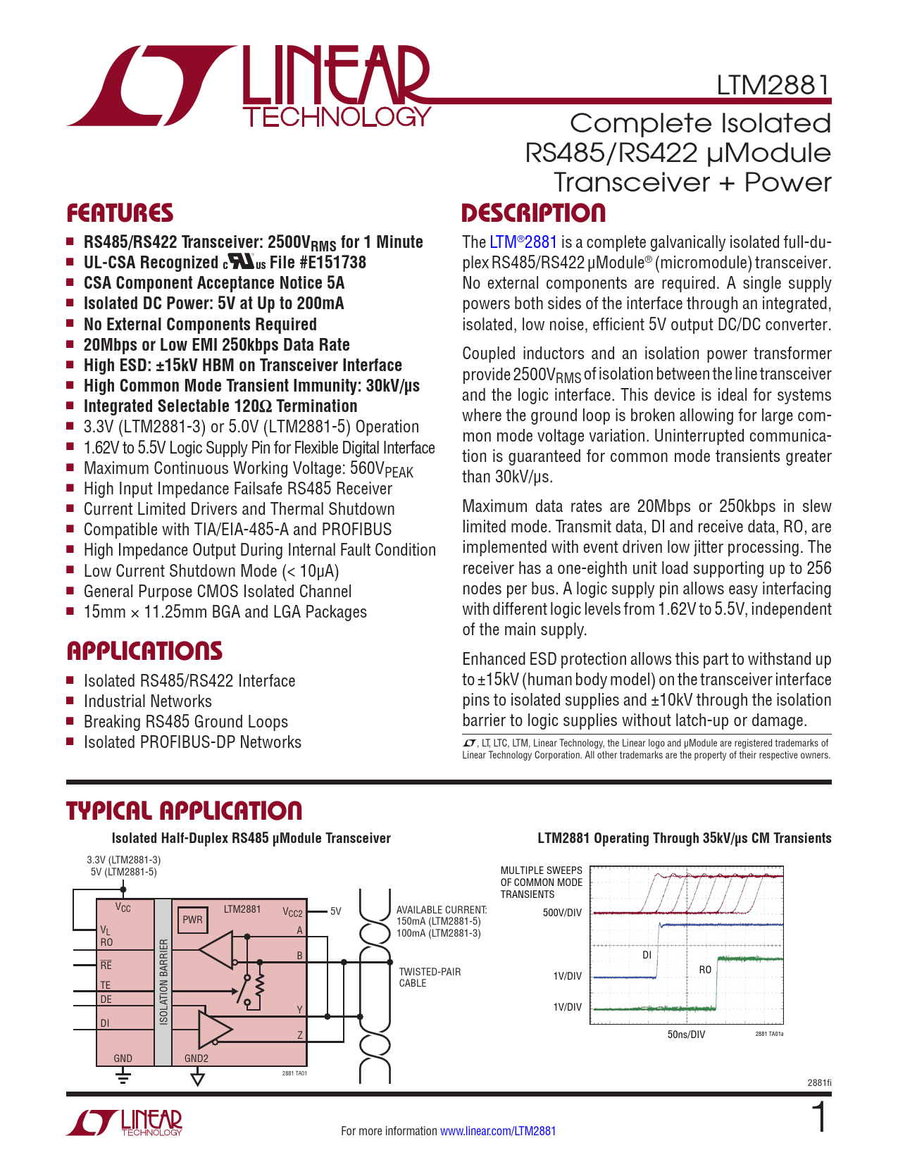 LTM2881 Complete Isolated RS485/RS422 µModule Transceiver + Power FeaTuresDescripTion n RS485/RS422 Transceiver: 2500VRMS for 1 Minute The LTM®2881 is a complete galvanically isolated full-du- n UL-CSA RecognizedFile #E151738 plex RS485/RS422 µModule® (micromodule) transceiver. n CSA Component Acceptance Notice 5A No external components are required. A single supply n Isolated DC Power: 5V at Up to 200mA powers both sides of the interface through an integrated, n No External Components Required isolated, low noise, efficient 5V output DC/DC converter. n 20Mbps or Low EMI 250kbps Data Rate Coupled inductors and an isolation power transformer n High ESD: ±15kV HBM on Transceiver Interface provide 2500VRMS of isolation between the line transceiver n High Common Mode Transient Immunity: 30kV/μs and the logic interface. This device is ideal for systems n Integrated Selectable 120Ω Termination where the ground loop is broken allowing for large com- n 3.3V (LTM2881-3) or 5.0V (LTM2881-5) Operation mon mode voltage variation. Uninterrupted communica- n 1.62V to 5.5V Logic Supply Pin for Flexible Digital Interface tion is guaranteed for common mode transients greater n Maximum Continuous Working Voltage: 560VPEAK than 30kV/μs. n High Input Impedance Failsafe RS485 Receiver n Current Limited Drivers and Thermal Shutdown Maximum data rates are 20Mbps or 250kbps in slew n Compatible with TIA/EIA-485-A and PROFIBUS limited mode. Transmit data, DI and receive data, RO, are n High Impedance Output During Internal Fault Condition implemented with event driven low jitter processing. The n Low Current Shutdown Mode (< 10µA) receiver has a one-eighth unit load supporting up to 256 n General Purpose CMOS Isolated Channel nodes per bus. A logic supply pin allows easy interfacing n 15mm × 11.25mm BGA and LGA Packages with different logic levels from 1.62V to 5.5V, independent of the main supply. applicaTions Enhanced ESD protection allows this part to withstand up n Isolated RS485/RS422 Interface to ±15kV (human body model) on the transceiver interface n Industrial Networks pins to isolated supplies and ±10kV through the isolation n Breaking RS485 Ground Loops barrier to logic supplies without latch-up or damage. n L Isolated PROFIBUS-DP Networks , LT, LTC, LTM, Linear Technology, the Linear logo and µModule are registered trademarks of Linear Technology Corporation. All other trademarks are the property of their respective owners. Typical applicaTionIsolated Half-Duplex RS485 μModule TransceiverLTM2881 Operating Through 35kV/μs CM Transients 3.3V (LTM2881-3) 5V (LTM2881-5) MULTIPLE SWEEPS OF COMMON MODE TRANSIENTS VCC LTM2881 V AVAILABLE CURRENT: CC2 5V 500V/DIV PWR 150mA (LTM2881-5) VL A 100mA (LTM2881-3) RO B DI RE TWISTED-PAIR 1V/DIV RO TE CABLE DE TION BARRIER Y 1V/DIV DI ISOLA Z 2881 TA01a 50ns/DIV GND GND2 2881 TA01 2881fi For more information www.linear.com/LTM2881 1 Document Outline Features Applications Typical Application Description Absolute Maximum Ratings Pin Configuration Order Information Electrical Characteristics Switching Characteristics Isolation Characteristics Typical Performance Characteristics Pin Functions Block Diagram Test Circuits Functional Table Applications Information Typical Applications Package Description Revision History Typical Application Related Parts