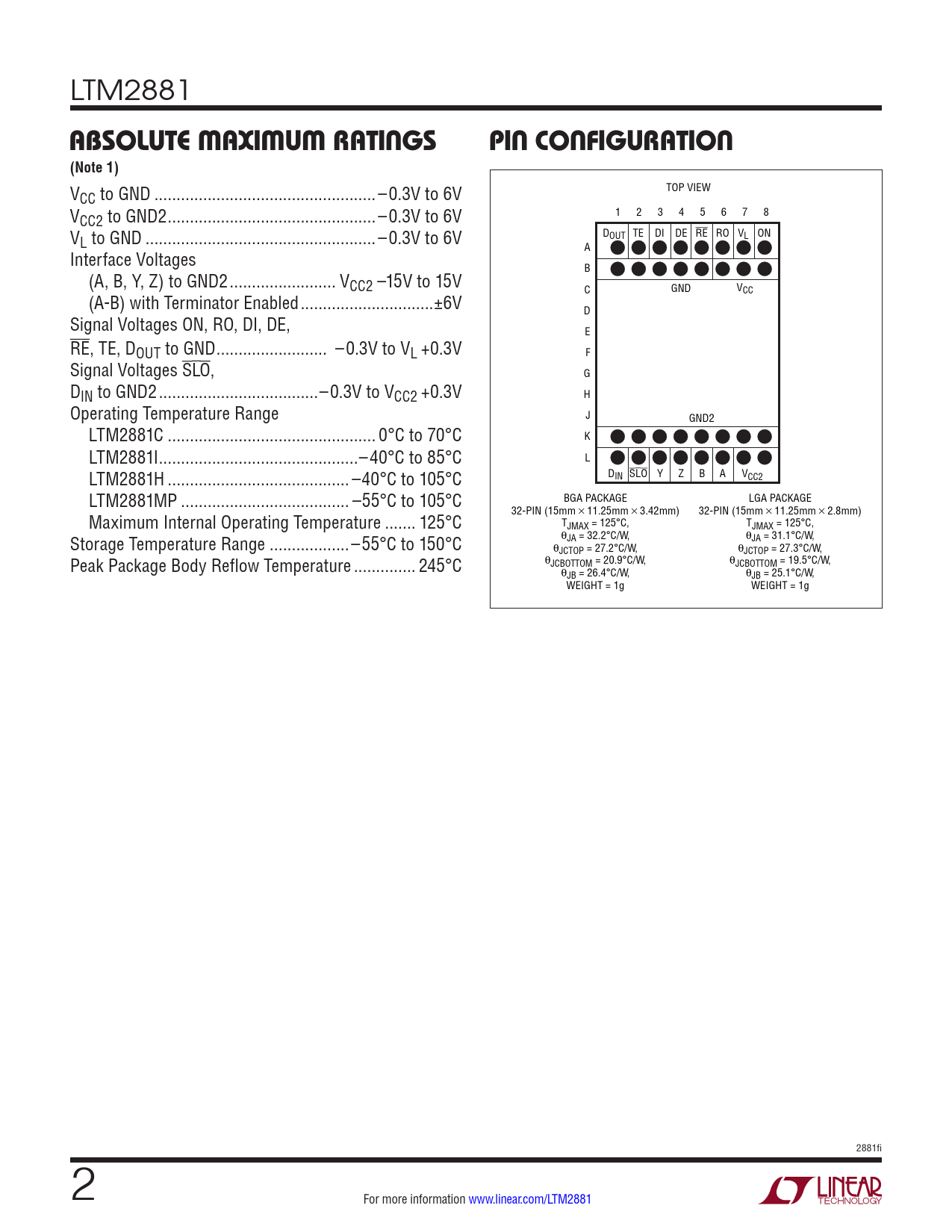 V TOP VIEW CC to GND .. –0.3V to 6V VCC2 to GND2 ...–0.3V to 6V 1 2 3 4 5 6 7 8 V DOUT TE DI DE RE RO V L to GND .. –0.3V to 6V L ON A Interface Voltages B (A, B, Y, Z) to GND2 .. VCC2 –15V to 15V C GND VCC (A-B) with Terminator Enabled ..±6V D Signal Voltages ON, RO, DI, DE, E RE, TE, DOUT to GND ... –0.3V to VL +0.3V F Signal Voltages SLO, G DIN to GND2 ..–0.3V to VCC2 +0.3V H Operating Temperature Range J GND2 LTM2881C ... 0°C to 70°C K LTM2881I ...–40°C to 85°C L LTM2881H ... –40°C to 105°C DIN SLO Y Z B A VCC2 LTM2881MP .. –55°C to 105°C BGA PACKAGE LGA PACKAGE Maximum Internal Operating Temperature ... 125°C 32-PIN (15mm × 11.25mm × 3.42mm) 32-PIN (15mm × 11.25mm × 2.8mm) TJMAX = 125°C, TJMAX = 125°C, Storage Temperature Range ..–55°C to 150°C θJA = 32.2°C/W, θJA = 31.1°C/W, θJCTOP = 27.2°C/W, θJCTOP = 27.3°C/W, Peak Package Body Reflow Temperature .. 245°C θJCBOTTOM = 20.9°C/W, θJCBOTTOM = 19.5°C/W, θJB = 26.4°C/W, θJB = 25.1°C/W, WEIGHT = 1g WEIGHT = 1g 2881fi 2 For more information www.linear.com/LTM2881 Document Outline Features Applications Typical Application Description Absolute Maximum Ratings Pin Configuration Order Information Electrical Characteristics Switching Characteristics Isolation Characteristics Typical Performance Characteristics Pin Functions Block Diagram Test Circuits Functional Table Applications Information Typical Applications Package Description Revision History Typical Application Related Parts