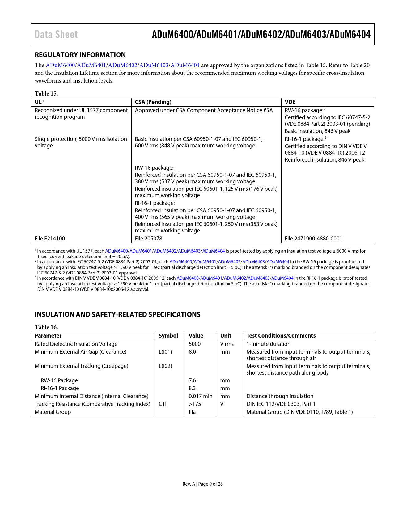 Data Sheet. ADuM6400/ADuM6401/ADuM6402/ADuM6403/ADuM6404. REGULATORY INFORMATION. Table 15. UL1. CSA (Pending). VDE