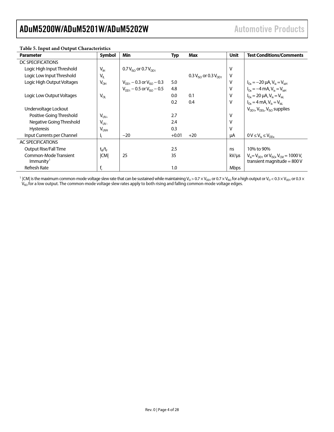 ADuM5200W/ADuM5201W/ADuM5202W. Automotive Products. Table 5. Input and Output Characteristics Parameter. Symbol. Min. Typ. Max. Unit