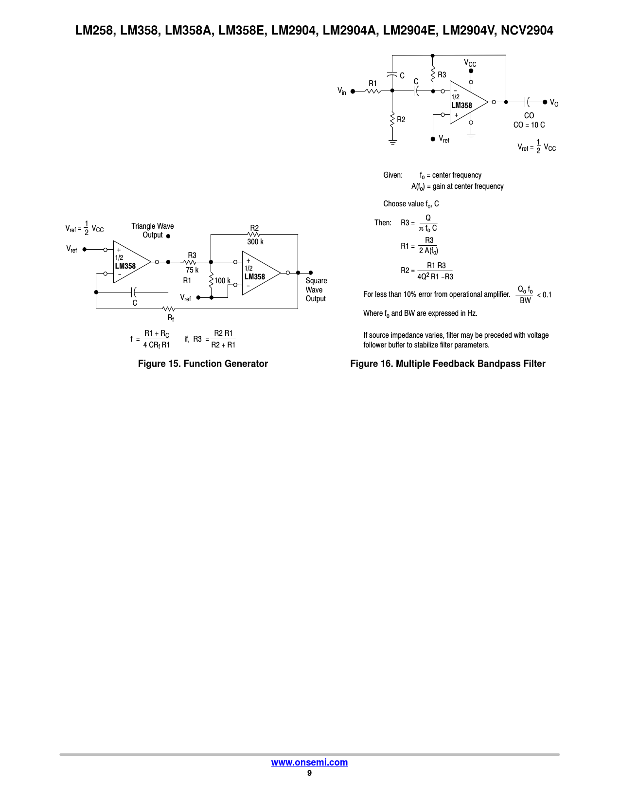 LM258, LM358, LM358A, LM358E, LM2904, LM2904A, LM2904E, LM2904V, NCV2904 VCC C R3 R1 C V - in 1/2 VO LM358 + CO R2 CO = 10 C Vref 1 V ref = VCC 2 Given: fo = center frequency A(fo) = gain at center frequency Choose value fo, C Q 1 Then: R3 = V Triangle Wave ref = VCC R2 f 2 o C Output R3 300 k R1 = Vref + 2 A(fo) R3 1/2 + LM358 R1 R3 75 k 1/2 R2 = - LM358 4Q2 R1 -R3 R1 100 k Square - Wave Q For less than 10% error from operational amplifier. o fo < 0.1 Vref Output BW C Where fo and BW are expressed in Hz. Rf R1 + RC R2 R1 If source impedance varies, filter may be preceded with voltage f = if, R3 = 4 CR R2 + R1 follower buffer to stabilize filter parameters. f R1 Figure 15. Function GeneratorFigure 16. Multiple Feedback Bandpass Filterwww.onsemi.com9