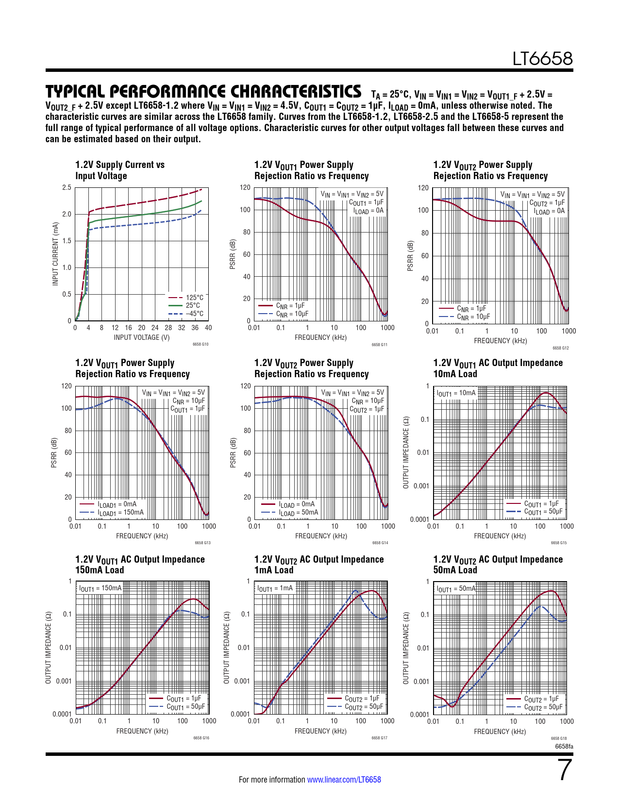 Typical perForMance characTerisTics TA = 25°C, VIN = VIN1 = VIN2 = VOUT1_F + 2.5V = VOUT2_F + 2.5V except LT6658-1.2 where VIN = VIN1 = VIN2 = 4.5V, COUT1 = COUT2 = 1µF, ILOAD = 0mA, unless otherwise noted. The characteristic curves are similar across the LT6658 family. Curves from the LT6658-1.2, LT6658-2.5 and the LT6658-5 represent the full range of typical performance of all voltage options. Characteristic curves for other output voltages fall between these curves and can be estimated based on their output. 1.2V Supply Current vs 1.2V VOUT1 Power Supply 1.2V VOUT2 Power Supply Input Voltage Rejection Ratio vs Frequency Rejection Ratio vs Frequency