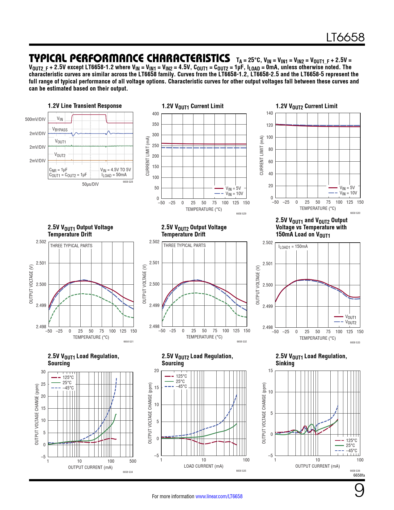 Typical perForMance characTerisTics TA = 25°C, VIN = VIN1 = VIN2 = VOUT1_F + 2.5V = VOUT2_F + 2.5V except LT6658-1.2 where VIN = VIN1 = VIN2 = 4.5V, COUT1 = COUT2 = 1µF, ILOAD = 0mA, unless otherwise noted. The characteristic curves are similar across the LT6658 family. Curves from the LT6658-1.2, LT6658-2.5 and the LT6658-5 represent the full range of typical performance of all voltage options. Characteristic curves for other output voltages fall between these curves and can be estimated based on their output. 1.2V Line Transient Response 1.2V VOUT1 Current Limit 1.2V VOUT2 Current Limit