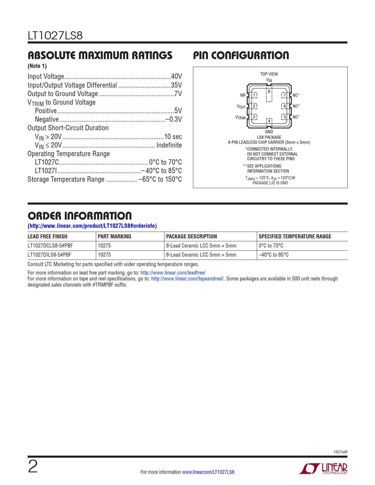 LT1027DCLS8-5#PBF 10275 8-Lead Ceramic LCC 5mm × 5mm 0°C to 70°C LT1027DILS8-5#PBF 10275 8-Lead Ceramic LCC 5mm × 5mm –40°C to 85°C Consult LTC Marketing for parts specified with wider operating temperature ranges. For more information on lead free part marking, go to: http://www.linear.com/leadfree/ For more information on tape and reel specifications, go to: http://www.linear.com/tapeandreel/. Some packages are available in 500 unit reels through designated sales channels with #TRMPBF suffix. 1027ls8f 2 For more information www.linear.com/LT1027LS8 Document Outline Features Applications Typical Application Description Absolute Maximum Ratings Order Information Pin Configuration Typical Performance Characteristics Pin Functions Block Diagram Applications Information Typical Applications Package Description Typical Application Related Parts