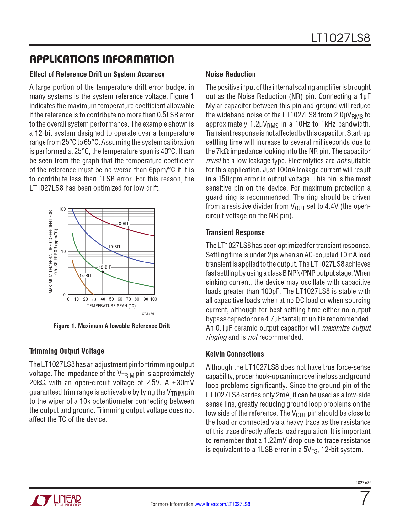 A large portion of the temperature drift error budget in The positive input of the internal scaling amplifier is brought many systems is the system reference voltage. Figure 1 out as the Noise Reduction (NR) pin. Connecting a 1µF indicates the maximum temperature coefficient allowable Mylar capacitor between this pin and ground will reduce if the reference is to contribute no more than 0.5LSB error the wideband noise of the LT1027LS8 from 2.0µVRMS to to the overall system performance. The example shown is approximately 1.2µVRMS in a 10Hz to 1kHz bandwidth. a 12-bit system designed to operate over a temperature Transient response is not affected by this capacitor. Start-up range from 25°C to 65°C. Assuming the system calibration settling time will increase to several milliseconds due to is performed at 25°C, the temperature span is 40°C. It can the 7kΩ impedance looking into the NR pin. The capacitor be seen from the graph that the temperature coefficient must be a low leakage type. Electrolytics are not suitable of the reference must be no worse than 6ppm/°C if it is for this application. Just 100nA leakage current will result to contribute less than 1LSB error. For this reason, the in a 150ppm error in output voltage. This pin is the most LT1027LS8 has been optimized for low drift. sensitive pin on the device. For maximum protection a guard ring is recommended. The ring should be driven 100 from a resistive divider from VOUT set to 4.4V (the open- circuit voltage on the NR pin). 8-BIT