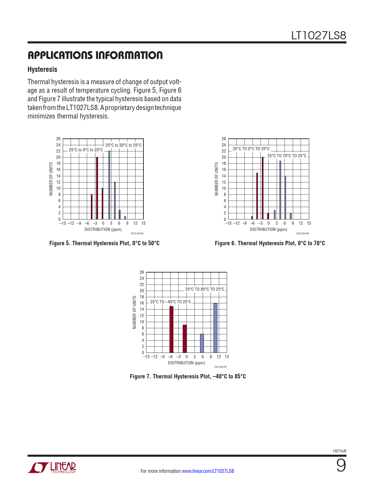 link to page 9 link to page 9 link to page 9 LT1027LS8 applicaTions inForMaTion Hysteresis Thermal hysteresis is a measure of change of output volt- age as a result of temperature cycling. Figure 5, Figure 6 and Figure 7 illustrate the typical hysteresis based on data taken from the LT1027LS8. A proprietary design technique minimizes thermal hysteresis. 26 26 24 25°C to 50°C to 25°C 24 25°C to 0°C to 25°C 22 25°C TO 0°C TO 25°C 22 20 25°C TO 70°C TO 25°C 20 18 18 16 16 14 14 12 12 10 10 NUMBER OF UNITS 8 NUMBER OF UNITS 8 6 6 4 4 2 2 0 0 –15 –12 –9 –6 –3 0 3 6 9 12 15 –15 –12 –9 –6 –3 0 3 6 9 12 15 DISTRIBUTION (ppm) DISTRIBUTION (ppm) 1027LS8 F05 1027LS8 F06 Figure 5. Thermal Hysteresis Plot, 0°C to 50°CFigure 6. Thermal Hysteresis Plot, 0°C to 70°C 26 24 22 25°C TO 85°C TO 25°C 20 18 25°C TO –40°C TO 25°C 16 14 12 10 NUMBER OF UNITS 8 6 4 2 0–15 –12 –9 –6 –3 0 3 6 9 12 15 DISTRIBUTION (ppm) 1027LS8 F07 Figure 7. Thermal Hysteresis Plot, –40°C to 85°C 1027ls8f For more information www.linear.com/LT1027LS8 9 Document Outline Features Applications Typical Application Description Absolute Maximum Ratings Order Information Pin Configuration Typical Performance Characteristics Pin Functions Block Diagram Applications Information Typical Applications Package Description Typical Application Related Parts