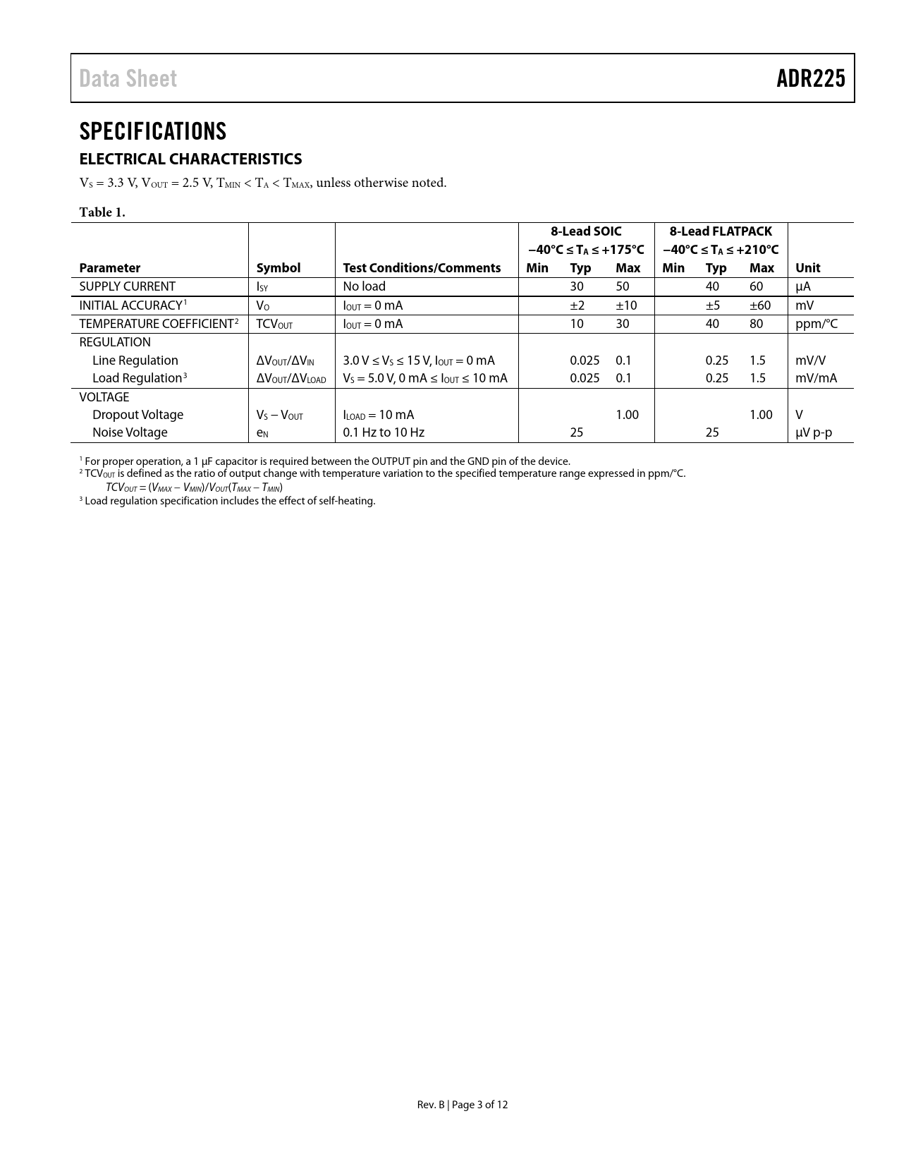 Data Sheet. ADR225. SPECIFICATIONS ELECTRICAL CHARACTERISTICS. Table 1. 8-Lead SOIC. 8-Lead FLATPACK. −40°C ≤ TA ≤ +175°C