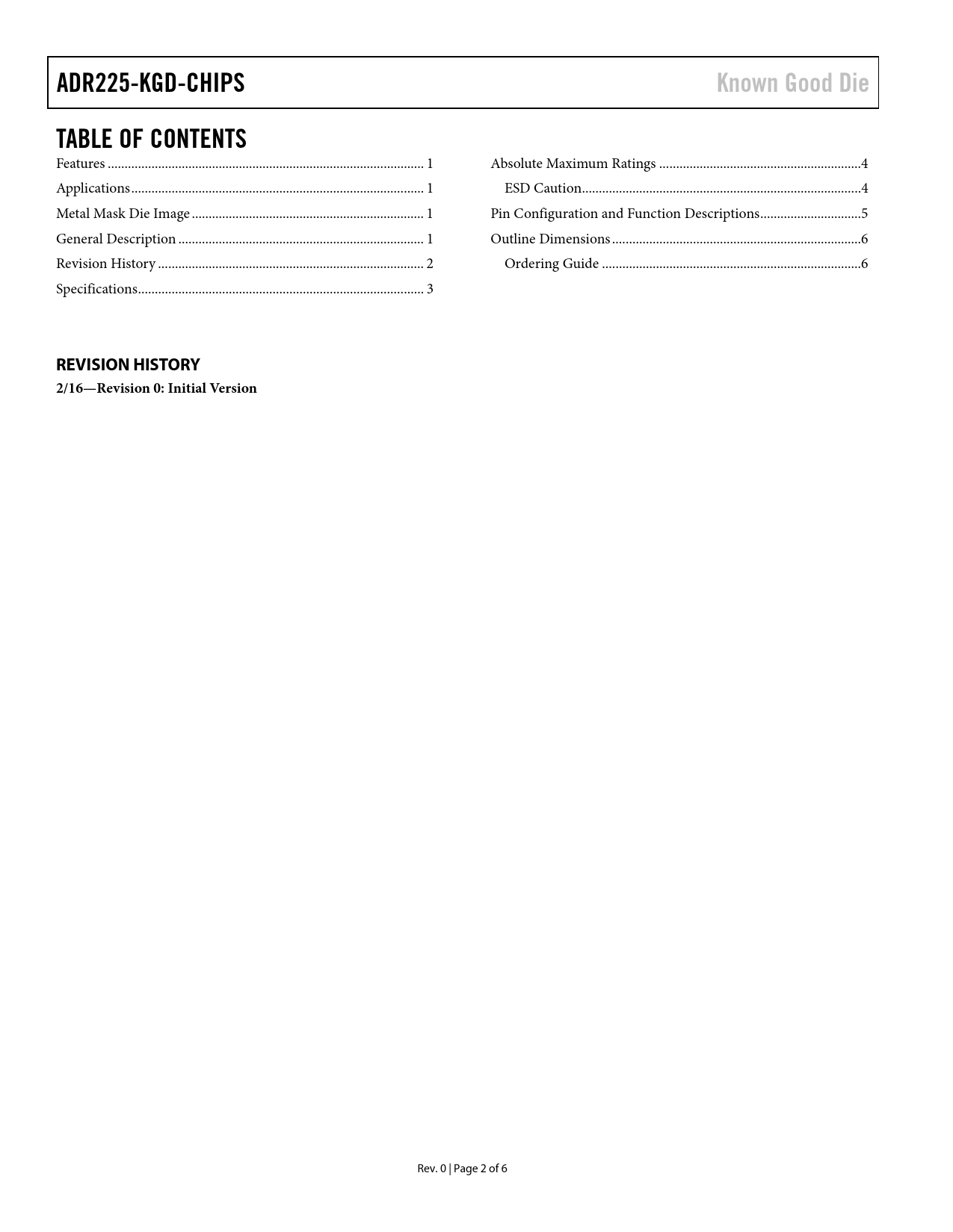 页数 / 页6 / 2 — ADR225-KGD-CHIPS. Known Good Die. TABLE OF CONTENTS. REVISION HISTORY …