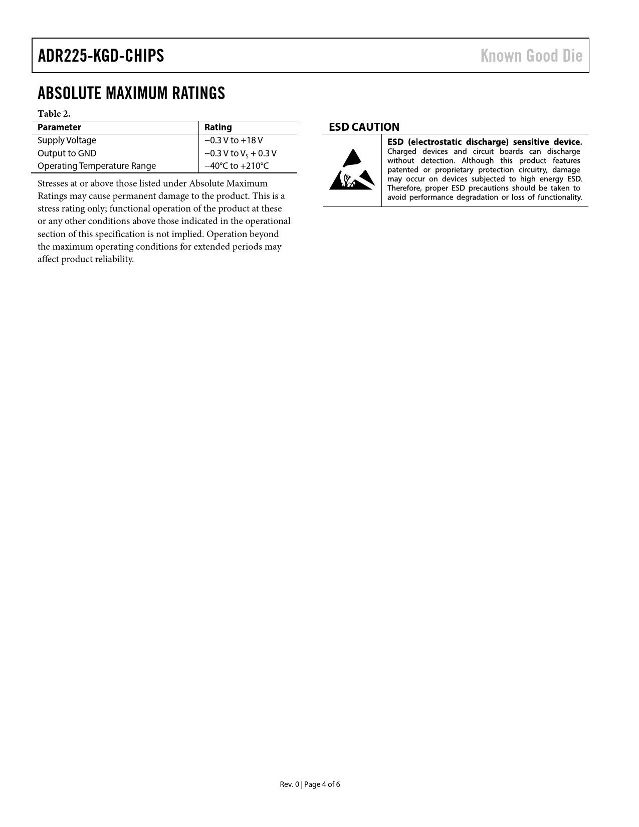 ADR225-KGD-CHIPS Known Good Die ABSOLUTE MAXIMUM RATINGS Table 2 Parameter Rating ESD CAUTION