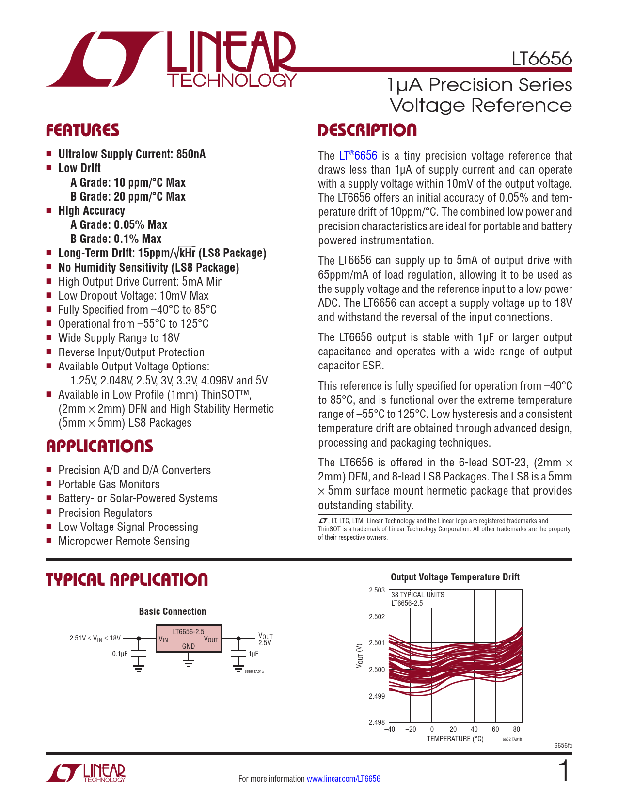 LT6656 1µA Precision Series Voltage Reference FEATURESDESCRIPTION n Ultralow Supply Current: 850nA The LT®6656 is a tiny precision voltage reference that n Low Drift draws less than 1µA of supply current and can operate A Grade: 10 ppm/°C Max with a supply voltage within 10mV of the output voltage. B Grade: 20 ppm/°C Max The LT6656 offers an initial accuracy of 0.05% and tem- n High Accuracy perature drift of 10ppm/°C. The combined low power and A Grade: 0.05% Max precision characteristics are ideal for portable and battery B Grade: 0.1% Max powered instrumentation. n Long-Term Drift: 15ppm/√kHr (LS8 Package) The LT6656 can supply up to 5mA of output drive with n No Humidity Sensitivity (LS8 Package) 65ppm/mA of load regulation, allowing it to be used as n High Output Drive Current: 5mA Min the supply voltage and the reference input to a low power n Low Dropout Voltage: 10mV Max ADC. The LT6656 can accept a supply voltage up to 18V n Fully Specified from –40°C to 85°C and withstand the reversal of the input connections. n Operational from –55°C to 125°C n Wide Supply Range to 18V The LT6656 output is stable with 1µF or larger output n Reverse Input/Output Protection capacitance and operates with a wide range of output n Available Output Voltage Options: capacitor ESR. 1.25V, 2.048V, 2.5V, 3V, 3.3V, 4.096V and 5V This reference is fully specified for operation from –40°C n Available in Low Profile (1mm) ThinSOT™, to 85°C, and is functional over the extreme temperature (2mm × 2mm) DFN and High Stability Hermetic range of –55°C to 125°C. Low hysteresis and a consistent (5mm × 5mm) LS8 Packages temperature drift are obtained through advanced design, processing and packaging techniques. APPLICATIONS The LT6656 is offered in the 6-lead SOT-23, (2mm × n Precision A/D and D/A Converters 2mm) DFN, and 8-lead LS8 Packages. The LS8 is a 5mm n Portable Gas Monitors × 5mm surface mount hermetic package that provides n Battery- or Solar-Powered Systems outstanding stability. n Precision Regulators L, LT, LTC, LTM, Linear Technology and the Linear logo are registered trademarks and n Low Voltage Signal Processing ThinSOT is a trademark of Linear Technology Corporation. All other trademarks are the property of their respective owners. n Micropower Remote Sensing TYPICAL APPLICATIONOutput Voltage Temperature Drift 2.503 38 TYPICAL UNITS LT6656-2.5 Basic Connection 2.502 LT6656-2.5 2.51V ≤ V V IN ≤ 18V OUT VIN VOUT 2.5V 2.501 GND (V) 0.1µF 1µF V OUT 6656 TA01a 2.500 2.499 2.498–40 –20 0 20 40 60 80 TEMPERATURE (°C) 6652 TA01b 6656fc For more information www.linear.com/LT6656 1 Document Outline Features Applications Description Typical Application Absolute Maximum Ratings Pin Configuration Order Information Available Options Electrical Characteristics Typical Performance Characteristics Pin Functions Block Diagram Applications Information Typical Applications Package Description Revision History Typical Application Related Parts