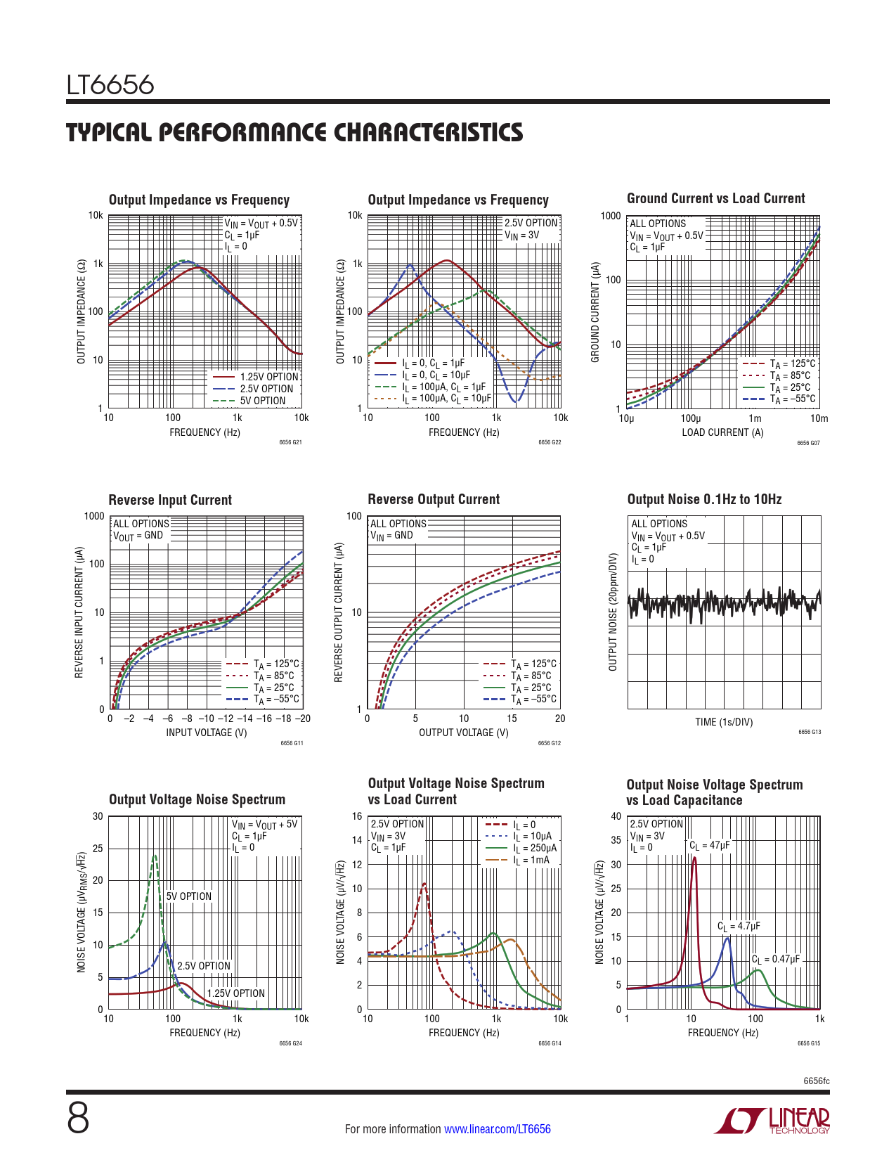 10k 10k 1000 VIN = VOUT + 0.5V 2.5V OPTION ALL OPTIONS CL = 1µF VIN = 3V VIN = VOUT + 0.5V IL = 0 CL = 1µF 1k 1k 100 100 100 10 OUTPUT IMPEDANCE (Ω) 10 OUTPUT IMPEDANCE (Ω) 10 GROUND CURRENT (µA) IL = 0, CL = 1µF TA = 125°C 1.25V OPTION IL = 0, CL = 10µF TA = 85°C 2.5V OPTION IL = 100µA, CL = 1µF TA = 25°C 5V OPTION IL = 100µA, CL = 10µF TA = –55°C 1 1 1 10 100 1k 10k 10 100 1k 10k 10µ 100µ 1m 10m FREQUENCY (Hz) FREQUENCY (Hz) LOAD CURRENT (A) 6656 G21 6656 G22 6656 G07