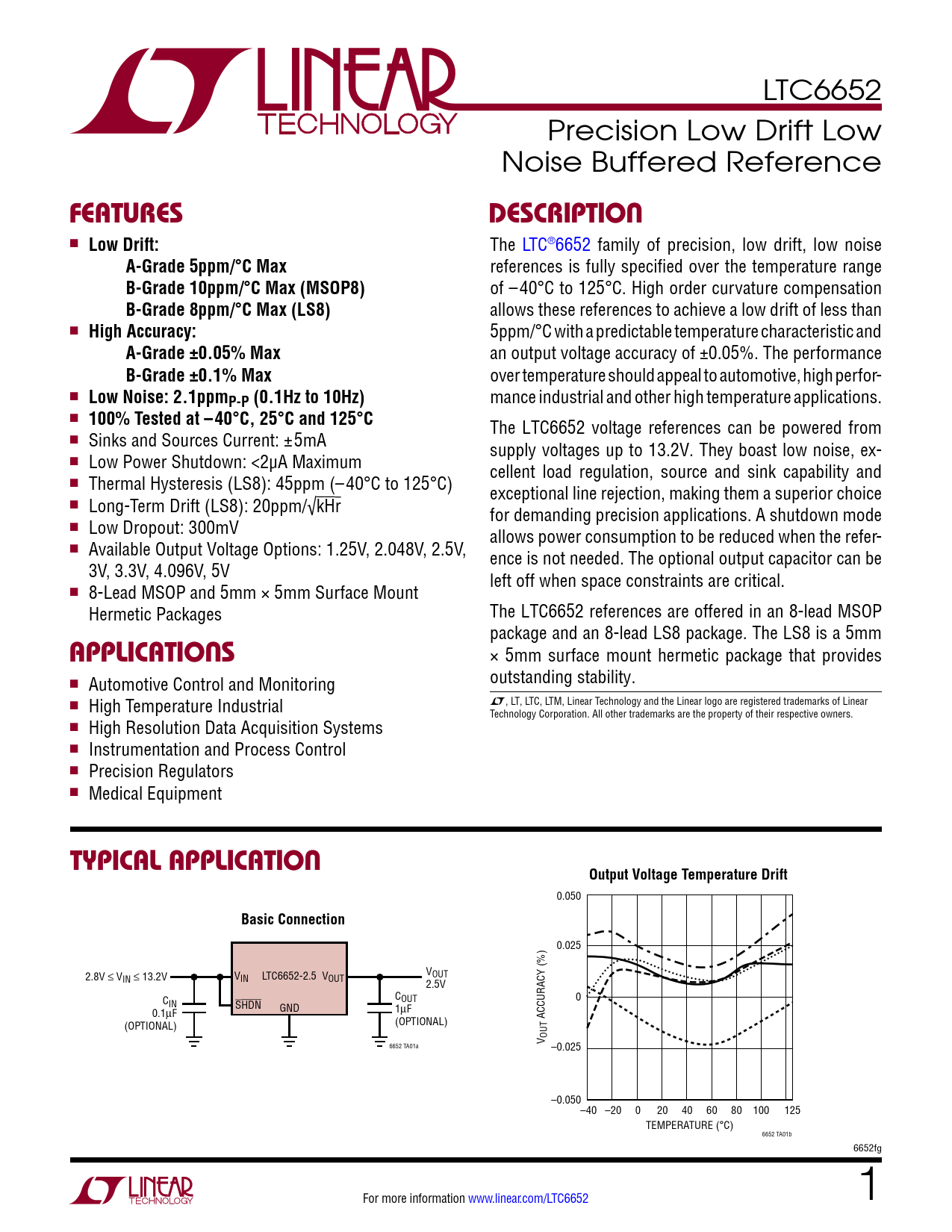 LTC6652 Precision Low Drift Low Noise Buffered Reference FeaturesDescription n Low Drift: The LTC®6652 family of precision, low drift, low noise A-Grade 5ppm/°C Max references is fully specified over the temperature range B-Grade 10ppm/°C Max (MSOP8) of –40°C to 125°C. High order curvature compensation B-Grade 8ppm/°C Max (LS8) allows these references to achieve a low drift of less than n High Accuracy: 5ppm/°C with a predictable temperature characteristic and A-Grade ±0.05% Max an output voltage accuracy of ±0.05%. The performance B-Grade ±0.1% Max over temperature should appeal to automotive, high perfor- n Low Noise: 2.1ppmP-P (0.1Hz to 10Hz) mance industrial and other high temperature applications. n 100% Tested at –40°C, 25°C and 125°C The LTC6652 voltage references can be powered from n Sinks and Sources Current: ±5mA supply voltages up to 13.2V. They boast low noise, ex- n Low Power Shutdown: <2µA Maximum cellent load regulation, source and sink capability and n Thermal Hysteresis (LS8): 45ppm (–40°C to 125°C) exceptional line rejection, making them a superior choice n Long-Term Drift (LS8): 20ppm/√kHr for demanding precision applications. A shutdown mode n Low Dropout: 300mV allows power consumption to be reduced when the refer- n Available Output Voltage Options: 1.25V, 2.048V, 2.5V, ence is not needed. The optional output capacitor can be 3V, 3.3V, 4.096V, 5V left off when space constraints are critical. n 8-Lead MSOP and 5mm × 5mm Surface Mount Hermetic Packages The LTC6652 references are offered in an 8-lead MSOP package and an 8-lead LS8 package. The LS8 is a 5mm applications × 5mm surface mount hermetic package that provides n outstanding stability. Automotive Control and Monitoring L, LT, LTC, LTM, Linear Technology and the Linear logo are registered trademarks of Linear n High Temperature Industrial Technology Corporation. All other trademarks are the property of their respective owners. n High Resolution Data Acquisition Systems n Instrumentation and Process Control n Precision Regulators n Medical Equipment typical applicationOutput Voltage Temperature Drift 0.050 Basic Connection 0.025 2.8V ≤ V V IN ≤ 13.2V VIN LTC6652-2.5 V OUT OUT 2.5V COUT 0 CIN SHDN 0.1µF GND 1µF ACCURACY (%) (OPTIONAL) (OPTIONAL) V OUT 6652 TA01a –0.025 –0.050–40 –20 0 20 40 60 80 100 125 TEMPERATURE (°C) 6652 TA01b 6652fg For more information www.linear.com/LTC6652 1 Document Outline Features Applications Typical Application Description Absolute Maximum Ratings Pin Configuration Order Information Available Options Electrical Characteristics Typical Performance Characteristics Pin Functions Block Diagram Applications Information Typical Applications Package Description Revision History Typical Application Related Parts