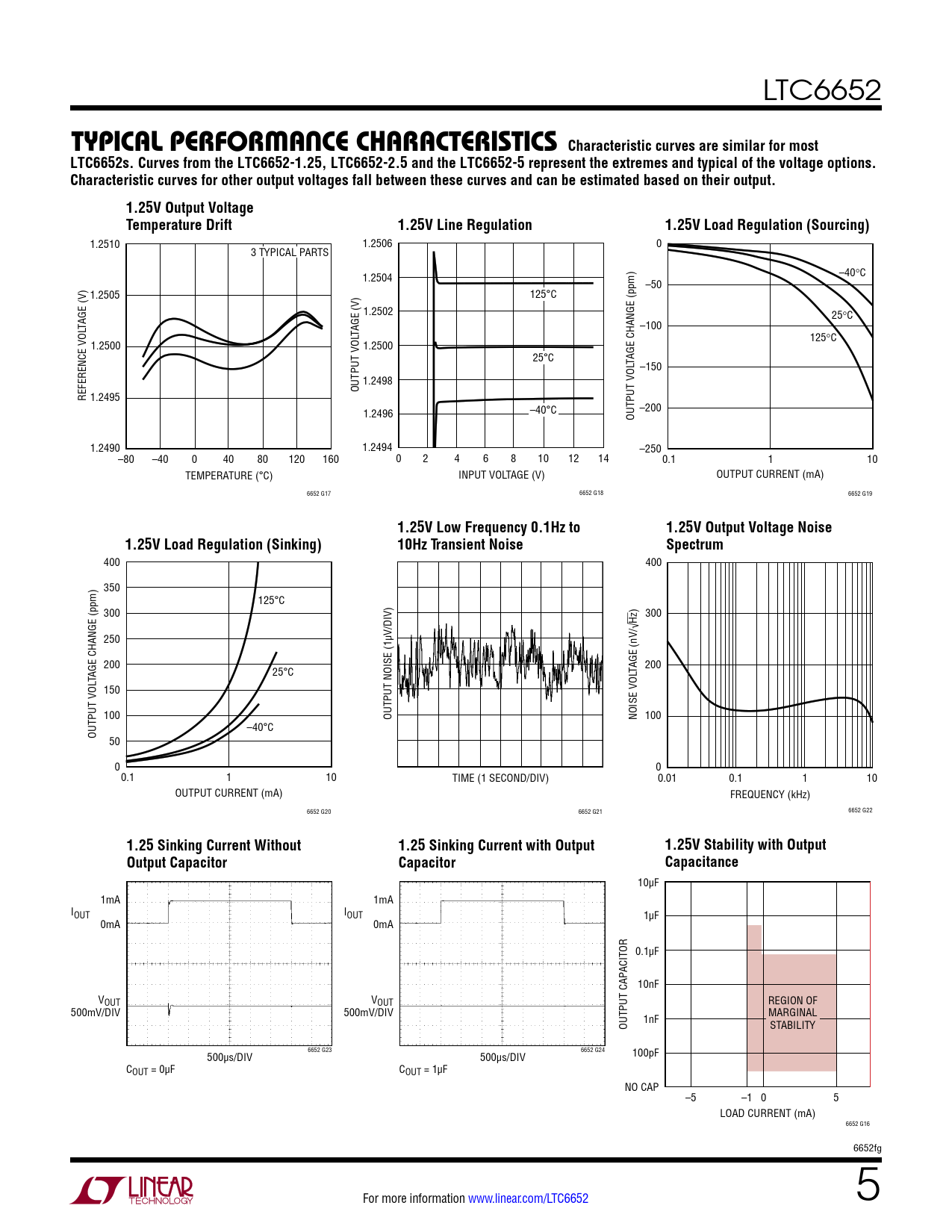 LTC6652 t ypical perForMance characteristics Characteristic curves are similar for mostLTC6652s. Curves from the LTC6652-1.25, LTC6652-2.5 and the LTC6652-5 represent the extremes and typical of the voltage options.Characteristic curves for other output voltages fall between these curves and can be estimated based on their output.1.25V Output VoltageTemperature Drift1.25V Line Regulation1.25V Load Regulation (Sourcing) 1.2510 1.2506 0 3 TYPICAL PARTS 1.2504 –40°C –50 1.2505 125°C 1.2502 25°C TAGE (V) –100 TAGE (V) 125°C 1.2500 1.2500 25°C TAGE CHANGE (ppm) –150 1.2498 OUTPUT VOL REFERENCE VOL 1.2495 1.2496 –40°C –200 OUTPUT VOL 1.2490 1.2494 –250 –80 –40 0 40 80 120 160 0 2 4 6 8 10 12 14 0.1 1 10 TEMPERATURE (°C) INPUT VOLTAGE (V) OUTPUT CURRENT (mA) 6652 G17 6652 G18 6652 G19 1.25V Low Frequency 0.1Hz to1.25V Output Voltage Noise1.25V Load Regulation (Sinking)10Hz Transient NoiseSpectrum 400 400 350 125°C ) 300 Hz 300 /√ 250 µV/DIV) 200 TAGE (nV 200 TAGE CHANGE (ppm) 25°C 150 100 OUTPUT NOISE (1 NOISE VOL 100 –40°C OUTPUT VOL 50 0 0 0.1 1 10 TIME (1 SECOND/DIV) 0.01 0.1 1 10 OUTPUT CURRENT (mA) FREQUENCY (kHz) 6652 G22 6652 G20 6652 G21 1.25 Sinking Current Without1.25 Sinking Current with Output1.25V Stability with OutputOutput CapacitorCapacitorCapacitance 10µF 1mA 1mA IOUT IOUT 1µF 0mA 0mA 0.1µF ACITOR 10nF VOUT VOUT REGION OF 500mV/DIV 500mV/DIV 1nF MARGINAL OUTPUT CAP STABILITY 6652 G23 6652 G24 500µs/DIV 500µs/DIV 100pF COUT = 0µF COUT = 1µF NO CAP –5 –1 0 5 LOAD CURRENT (mA) 6652 G16 6652fg For more information www.linear.com/LTC6652 5 Document Outline Features Applications Typical Application Description Absolute Maximum Ratings Pin Configuration Order Information Available Options Electrical Characteristics Typical Performance Characteristics Pin Functions Block Diagram Applications Information Typical Applications Package Description Revision History Typical Application Related Parts