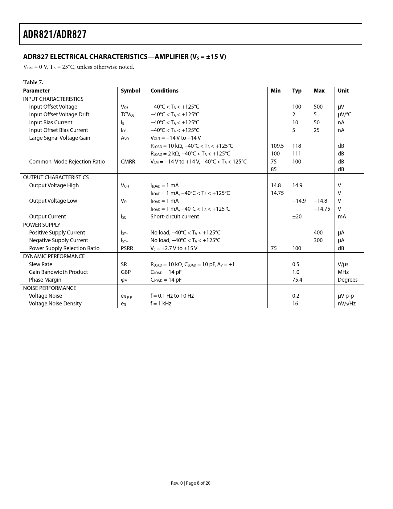 ADR821/ADR827ADR827 ELECTRICAL CHARACTERISTICS—AMPLIFIER (VS = ±15 V) VCM = 0 V, TA = 25°C, unless otherwise noted. Table 7. Parameter SymbolConditionsMinTypMaxUnit INPUT CHARACTERISTICS Input Offset Voltage VOS −40°C < TA < +125°C 100 500 μV Input Offset Voltage Drift TCVOS −40°C < TA < +125°C 2 5 μV/°C Input Bias Current IB −40°C < TA < +125°C 10 50 nA Input Offset Bias Current IOS −40°C < TA < +125°C 5 25 nA Large Signal Voltage Gain AVO VOUT = −14 V to +14 V RLOAD = 10 kΩ, −40°C < TA < +125°C 109.5 118 dB RLOAD = 2 kΩ, −40°C < TA < +125°C 100 111 dB Common-Mode Rejection Ratio CMRR VCM = −14 V to +14 V, −40°C < TA < 125°C 75 100 dB 85 dB OUTPUT CHARACTERISTICS Output Voltage High VOH ILOAD = 1 mA 14.8 14.9 V ILOAD = 1 mA, −40°C < TA < +125°C 14.75 V Output Voltage Low VOL ILOAD = 1 mA −14.9 −14.8 V ILOAD = 1 mA, −40°C < TA < +125°C −14.75 V Output Current ISC Short-circuit current ±20 mA POWER SUPPLY Positive Supply Current ISY+ No load, −40°C < TA < +125°C 400 μA Negative Supply Current ISY− No load, −40°C < TA < +125°C 300 μA Power Supply Rejection Ratio PSRR VS = ±2.7 V to ±15 V 75 100 dB DYNAMIC PERFORMANCE Slew Rate SR RLOAD = 10 kΩ, CLOAD = 10 pF, AV = +1 0.5 V/μs Gain Bandwidth Product GBP CLOAD = 14 pF 1.0 MHz Phase Margin φM CLOAD = 14 pF 75.4 Degrees NOISE PERFORMANCE Voltage Noise eN p-p f = 0.1 Hz to 10 Hz 0.2 μV p-p Voltage Noise Density eN f = 1 kHz 16 nV/√Hz Rev. 0 | Page 8 of 20 Document Outline FEATURES APPLICATIONS FUNCTIONAL BLOCK DIAGRAM GENERAL DESCRIPTION REVISION HISTORY SPECIFICATIONS ADR821 ELECTRICAL CHARACTERISTICS—REFERENCE ADR821 ELECTRICAL CHARACTERISTICS—AMPLIFIER (VS = ±2.8 V) ADR821 ELECTRICAL CHARACTERISTICS—AMPLIFIER (VS = ±15 V) ADR827 ELECTRICAL CHARACTERISTICS—REFERENCE ADR827 ELECTRICAL CHARACTERISTICS—AMPLIFIER (VS = ±2.7 V) ADR827 ELECTRICAL CHARACTERISTICS—AMPLIFIER (VS = ±15 V) ABSOLUTE MAXIMUM RATINGS THERMAL RESISTANCE ESD CAUTION PIN CONFIGURATION AND FUNCTION DESCRIPTIONS TYPICAL PERFORMANCE CHARACTERISTICS REFERENCE AMPLIFIER APPLICATIONS INFORMATION +2.5 V AND −2.5 V OUTPUTS (ADR821) 2.5 V AND 5.0 V OUTPUTS (ADR821) MULTIPLE 2.5 V OUTPUTS (ADR821) OUTLINE DIMENSIONS ORDERING GUIDE