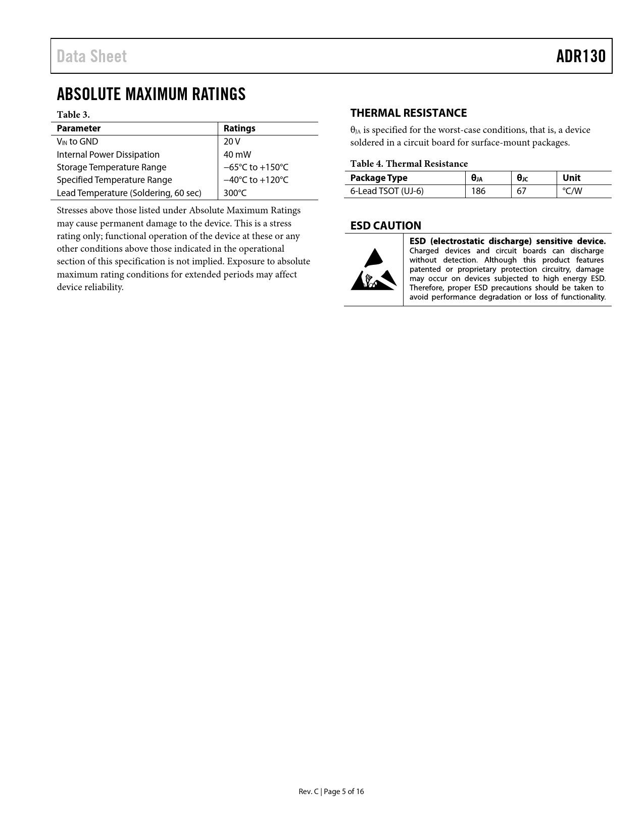 Data Sheet ADR130 ABSOLUTE MAXIMUM RATINGS Table 3 THERMAL RESISTANCE Parameter Ratings Table 4 Thermal Resistance