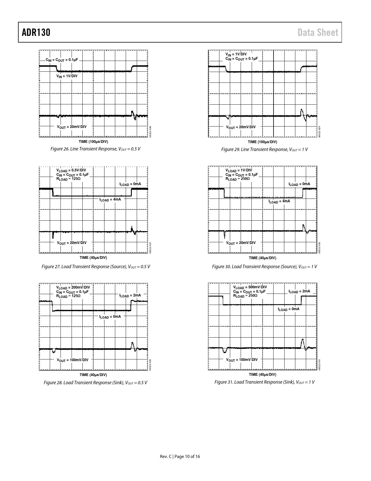 | 页数 / 页 | 16 / 10 — ADR130. Data Sheet. VIN = 1V/DIV. IN = COUT = 0.1µF. VOUT = 20mV/DIV. OUT … |