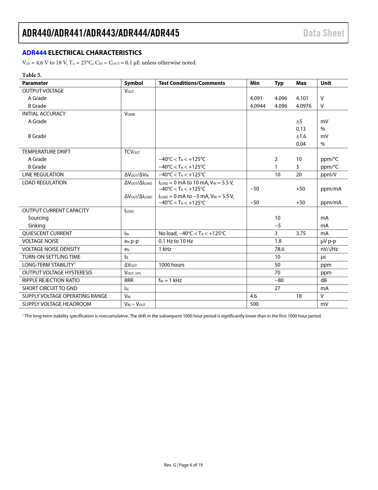 ADR440/ADR441/ADR443/ADR444/ADR445. Data Sheet. ADR444 EL. ECTRICAL CHARACTERISTICS. Table 5. Parameter. Symbol