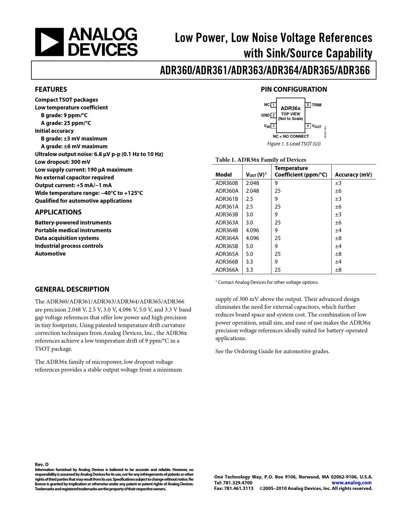 Low Power, Low Noise Voltage References. with Sink/Source Capability. ADR360/ADR361/ADR363/ADR364/ADR365/ADR366. FEATURES