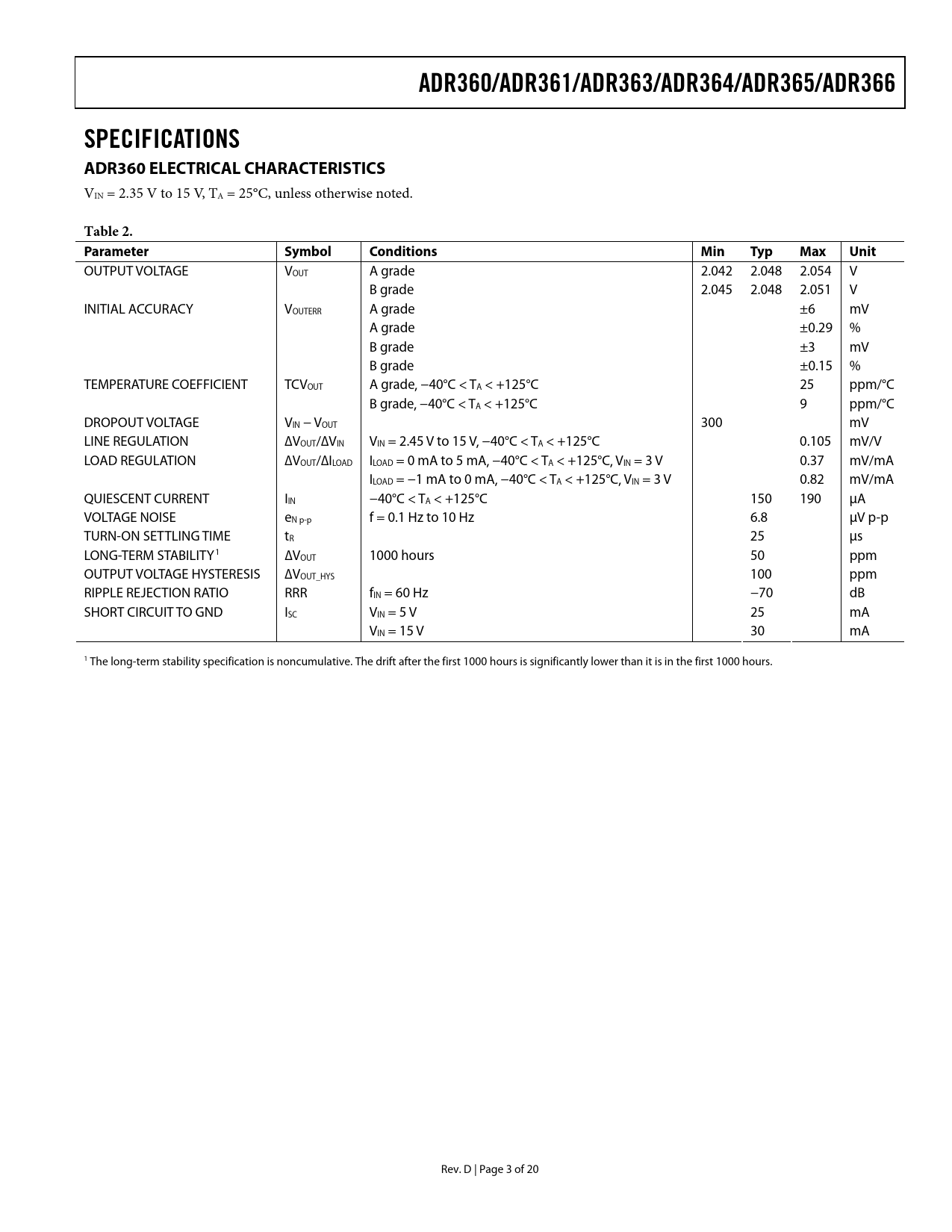 link to page 3 ADR360/ADR361/ADR363/ADR364/ADR365/ADR366SPECIFICATIONS ADR360 ELECTRICAL CHARACTERISTICS VIN = 2.35 V to 15 V, TA = 25°C, unless otherwise noted. Table 2. Parameter SymbolConditionsMinTypMaxUnit OUTPUT VOLTAGE VOUT A grade 2.042 2.048 2.054 V B grade 2.045 2.048 2.051 V INITIAL ACCURACY VOUTERR A grade ±6 mV A grade ±0.29 % B grade ±3 mV B grade ±0.15 % TEMPERATURE COEFFICIENT TCVOUT A grade, −40°C < TA < +125°C 25 ppm/°C B grade, −40°C < TA < +125°C 9 ppm/°C DROPOUT VOLTAGE VIN − VOUT 300 mV LINE REGULATION ∆VOUT/∆VIN VIN = 2.45 V to 15 V, −40°C < TA < +125°C 0.105 mV/V LOAD REGULATION ∆VOUT/∆ILOAD ILOAD = 0 mA to 5 mA, −40°C < TA < +125°C, VIN = 3 V 0.37 mV/mA ILOAD = −1 mA to 0 mA, −40°C < TA < +125°C, VIN = 3 V 0.82 mV/mA QUIESCENT CURRENT IIN −40°C < TA < +125°C 150 190 μA VOLTAGE NOISE eN p-p f = 0.1 Hz to 10 Hz 6.8 μV p-p TURN-ON SETTLING TIME tR 25 μs LONG-TERM STABILITY1 ∆VOUT 1000 hours 50 ppm OUTPUT VOLTAGE HYSTERESIS ∆VOUT_HYS 100 ppm RIPPLE REJECTION RATIO RRR fIN = 60 Hz −70 dB SHORT CIRCUIT TO GND ISC VIN = 5 V 25 mA VIN = 15 V 30 mA 1 The long-term stability specification is noncumulative. The drift after the first 1000 hours is significantly lower than it is in the first 1000 hours. Rev. D | Page 3 of 20 Document Outline FEATURES APPLICATIONS PIN CONFIGURATION GENERAL DESCRIPTION TABLE OF CONTENTS REVISION HISTORY SPECIFICATIONS ADR360 ELECTRICAL CHARACTERISTICS ADR361 ELECTRICAL CHARACTERISTICS ADR363 ELECTRICAL CHARACTERISTICS ADR364 ELECTRICAL CHARACTERISTICS ADR365 ELECTRICAL CHARACTERISTICS ADR366 ELECTRICAL CHARACTERISTICS ABSOLUTE MAXIMUM RATINGS THERMAL RESISTANCE ESD CAUTION TYPICAL PERFORMANCE CHARACTERISTICS TERMINOLOGY THEORY OF OPERATION DEVICE POWER DISSIPATION CONSIDERATIONS INPUT CAPACITOR OUTPUT CAPACITOR APPLICATIONS INFORMATION BASIC VOLTAGE REFERENCE CONNECTION Stacking Reference ICs for Arbitrary Outputs Negative Precision Reference Without Precision Resistors General-Purpose Current Source Trim Terminal OUTLINE DIMENSIONS ORDERING GUIDE AUTOMOTIVE PRODUCTS