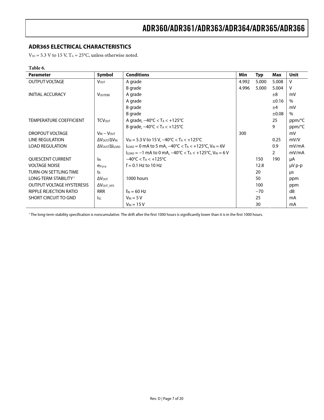 ADR360/ADR361/ADR363/ADR364/ADR365/ADR366 ADR365 ELECTRICAL CHARACTERISTICS Table 6 Parameter Symbol Conditions Min Typ Max