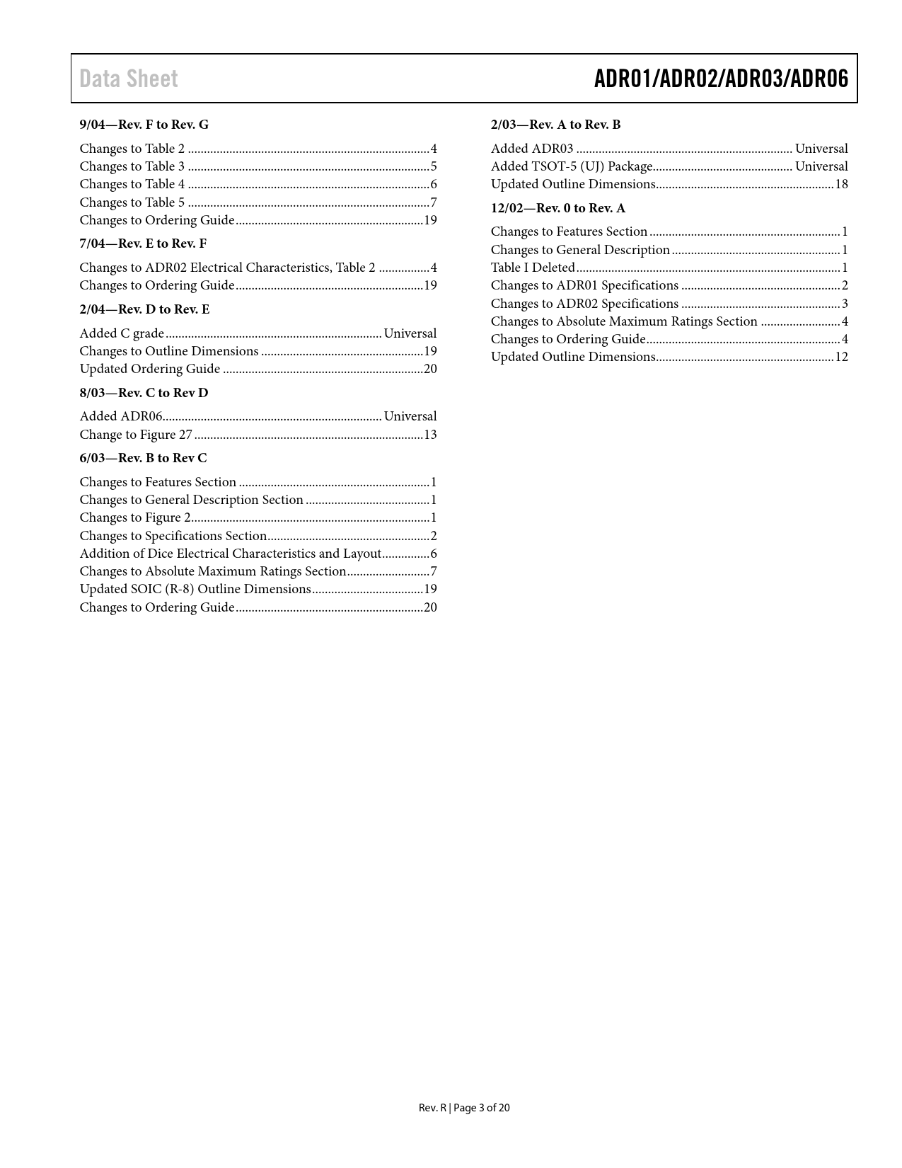 页数 / 页20 / 3 — Data Sheet. ADR01/ADR02/ADR03/ADR06. 9/04—Rev. F to Rev. G. 2/03—Rev. A …