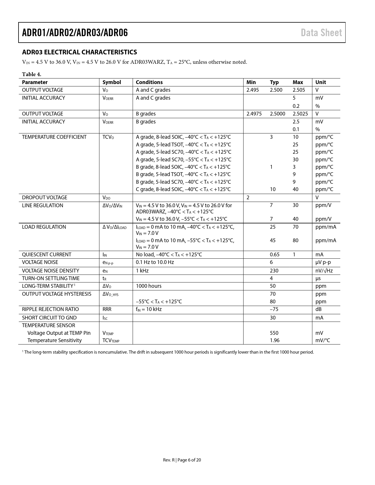 ADR01/ADR02/ADR03/ADR06. Data Sheet. ADR03 ELECTRICAL CHARACTERISTICS. Table 4. Parameter. Symbol. Conditions. Min. Typ. Max. Unit