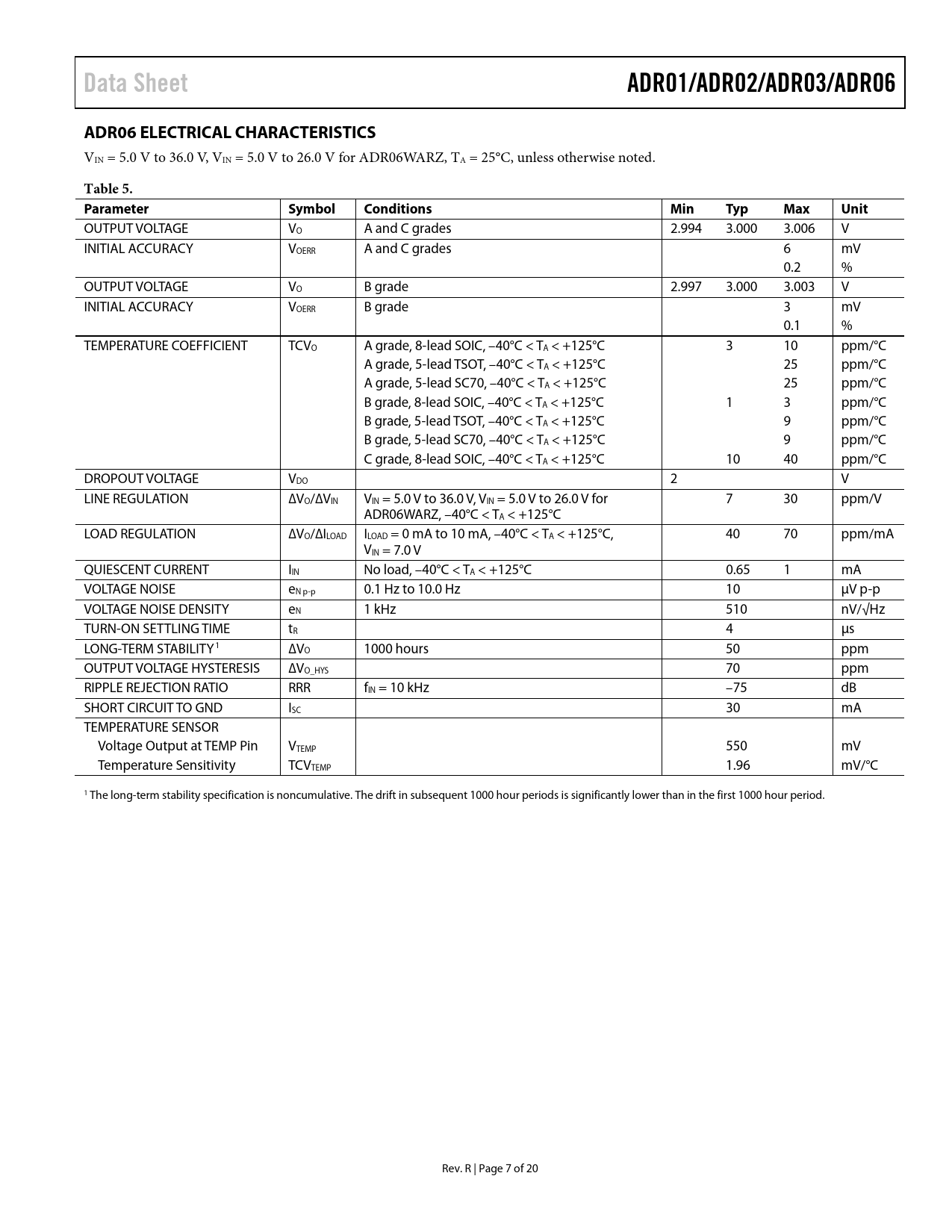 Data Sheet. ADR01/ADR02/ADR03/ADR06. ADR06 ELECTRICAL CHARACTERISTICS. Table 5. Parameter. Symbol. Conditions. Min. Typ. Max. Unit