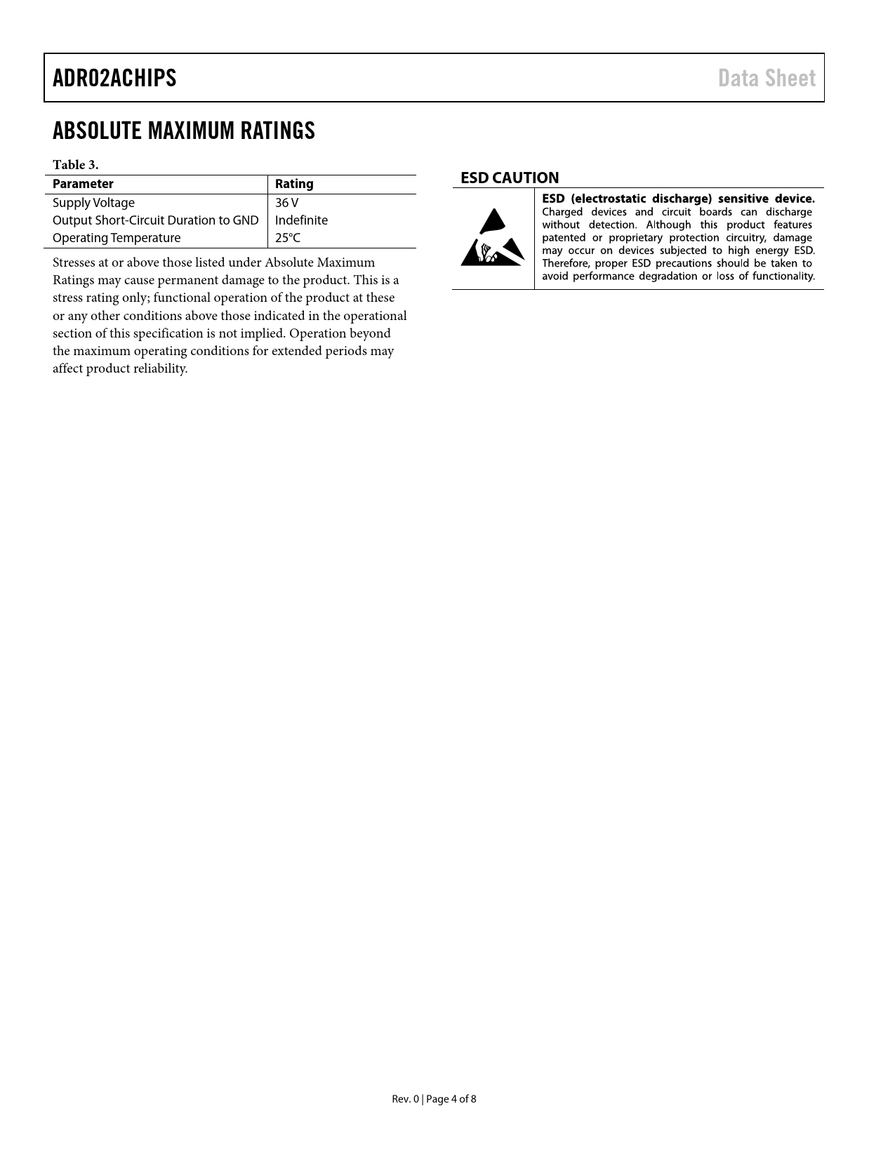 页数 / 页8 / 4 — ADR02ACHIPS. Data Sheet. ABSOLUTE MAXIMUM RATINGS. Table 3. Parameter. …