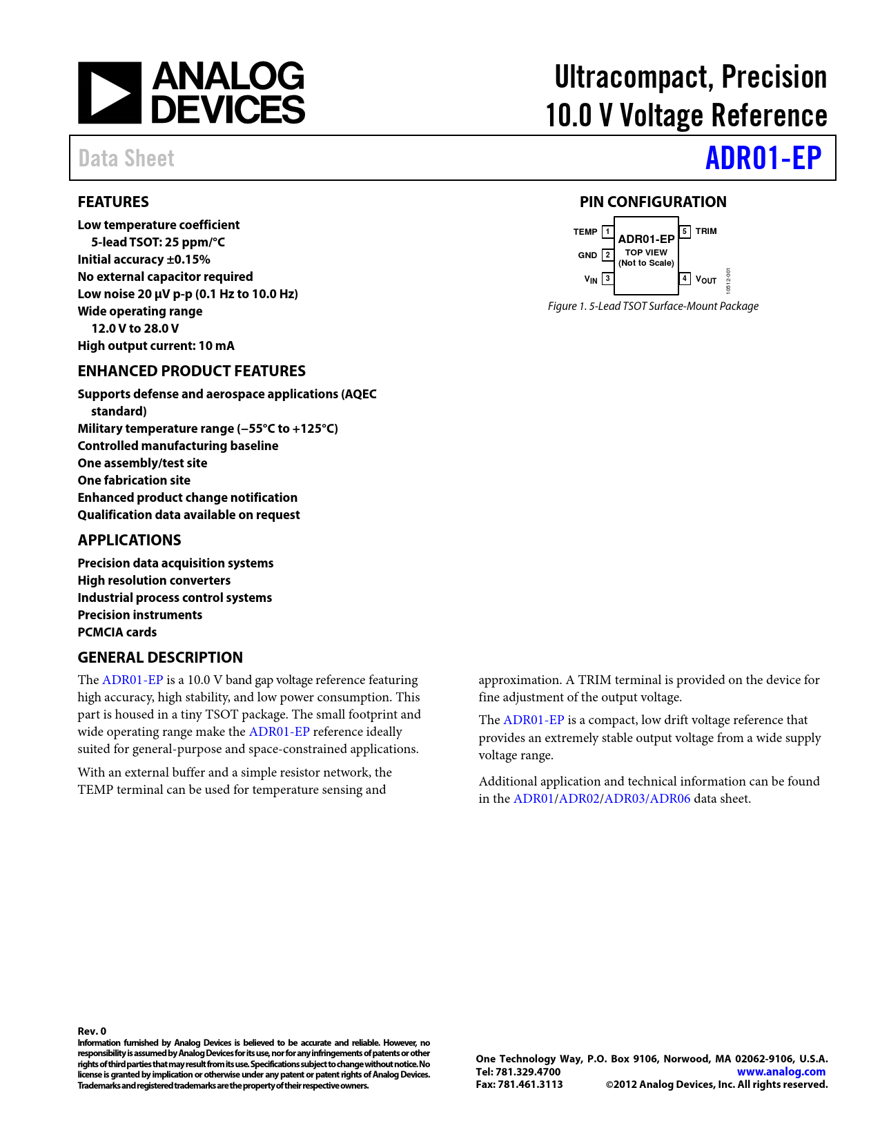 Ultracompact, Precision. 10.0 V Voltage Reference. Data Sheet. ADR01-EP. FEATURES. PIN CONFIGURATION. Low temperature coefficient
