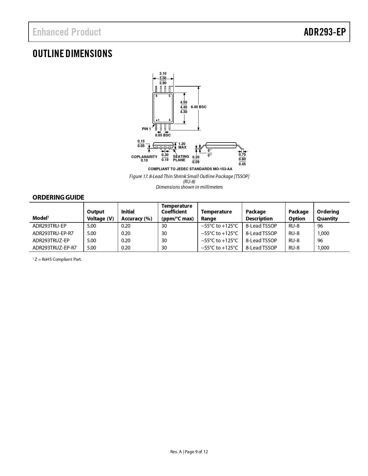 ADR293TRU-EP 5.00 0.20 30 −55°C to +125°C 8-Lead TSSOP RU-8 96 ADR293TRU-EP-R7 5.00 0.20 30 −55°C to +125°C 8-Lead TSSOP RU-8 1,000 ADR293TRUZ-EP 5.00 0.20 30 −55°C to +125°C 8-Lead TSSOP RU-8 96 ADR293TRUZ-EP-R7 5.00 0.20 30 −55°C to +125°C 8-Lead TSSOP RU-8 1,000 1 Z = RoHS Compliant Part. Rev. A | Page 9 of 12 Document Outline Features Enhanced Product Features Applications Pin Configuration General Description Revision History Specifications Electrical Specifications Absolute Maximum Ratings Thermal Resistance ESD Caution Typical Performance Characteristics Outline Dimensions Ordering Guide