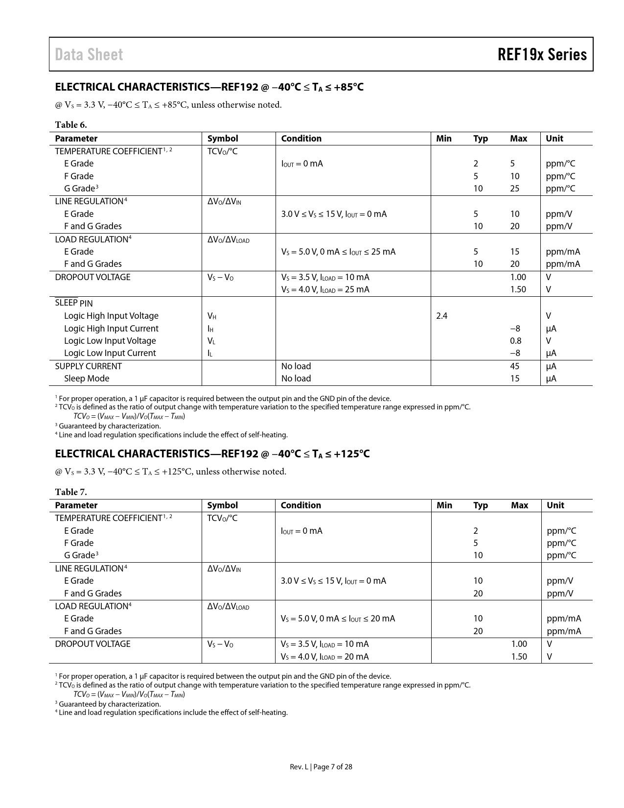 Data Sheet. REF19x Series. ELECTRICAL CHARACTERISTICS—REF192 @ −40°C ≤ TA ≤ +85°C. Table 6. Parameter Symbol. Condition Min. Typ