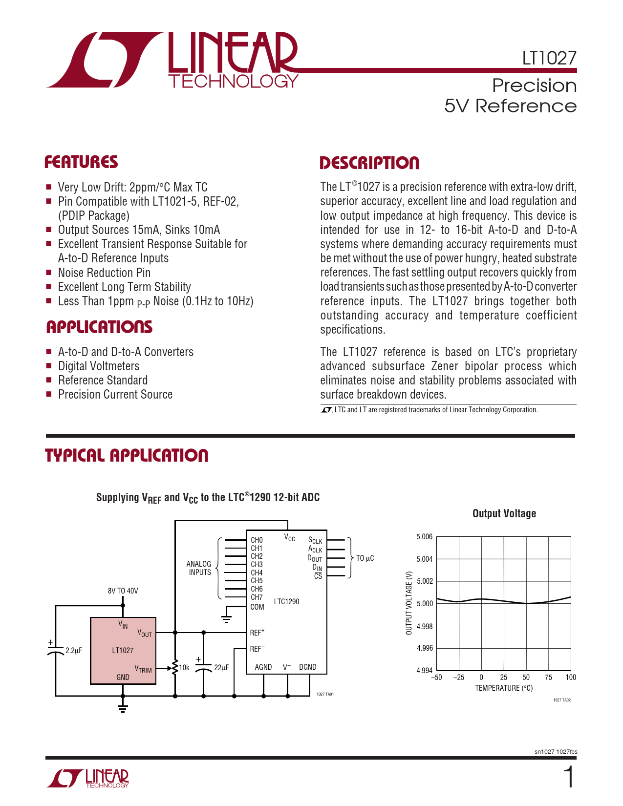 LT1027 Precision 5V Reference UFEATURESDESCRIPTIO ■ Very Low Drift: 2ppm/°C Max TC The LT®1027 is a precision reference with extra-low drift, ■ Pin Compatible with LT1021-5, REF-02, superior accuracy, excellent line and load regulation and (PDIP Package) low output impedance at high frequency. This device is ■ Output Sources 15mA, Sinks 10mA intended for use in 12- to 16-bit A-to-D and D-to-A ■ Excellent Transient Response Suitable for systems where demanding accuracy requirements must A-to-D Reference Inputs be met without the use of power hungry, heated substrate ■ Noise Reduction Pin references. The fast settling output recovers quickly from ■ Excellent Long Term Stability load transients such as those presented by A-to-D converter ■ Less Than 1ppm P-P Noise (0.1Hz to 10Hz) reference inputs. The LT1027 brings together both U outstanding accuracy and temperature coefficient APPLICATIO S specifications. ■ A-to-D and D-to-A Converters The LT1027 reference is based on LTC’s proprietary ■ Digital Voltmeters advanced subsurface Zener bipolar process which ■ Reference Standard eliminates noise and stability problems associated with ■ Precision Current Source surface breakdown devices. , LTC and LT are registered trademarks of Linear Technology Corporation. UTYPICAL APPLICATIOSupplying VREF and VCC to the LTC®1290 12-bit ADCOutput Voltage 5.006 CH0 VCC SCLK CH1 ACLK CH2 DOUT TO µC 5.004 ANALOG CH3 DIN INPUTS CH4 CS CH5 5.002 8V TO 40V CH6 CH7 LTC1290 COM 5.000 VIN 4.998 VOUT REF+ OUTPUT VOLTAGE (V) + 2.2µF LT1027 REF– 4.996 + V AGND TRIM 10k 22µF V– DGND 4.994 GND –50 –25 0 25 50 75 100 TEMPERATURE (°C) 1027 TA01 1027 TA02 sn1027 1027fcs 1