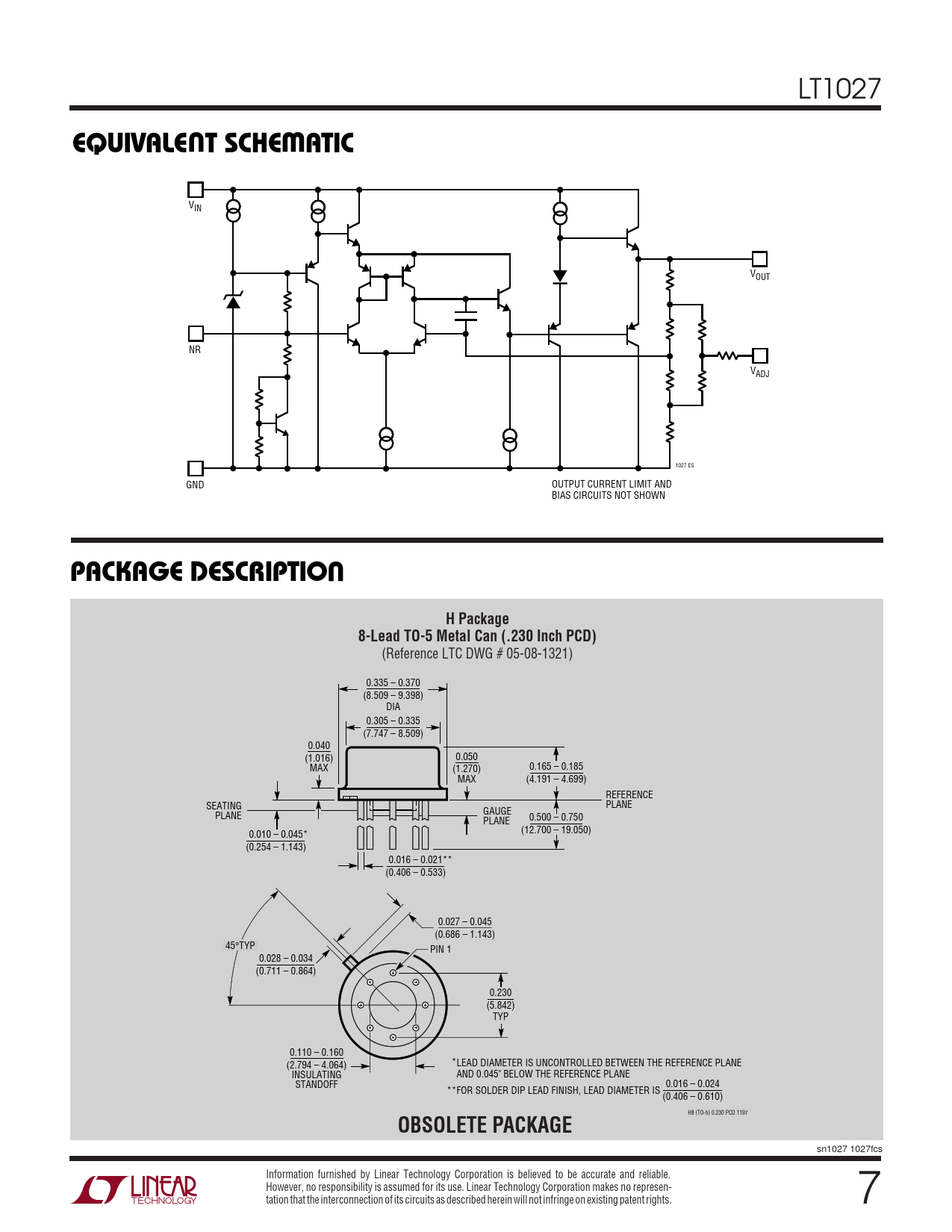 EQUIVALE T SCHE ATIC. PACKAGE DESCRIPTIO. H Package. 8-Lead TO-5 Metal Can (.230 Inch PCD). OBSOLETE PACKAGE