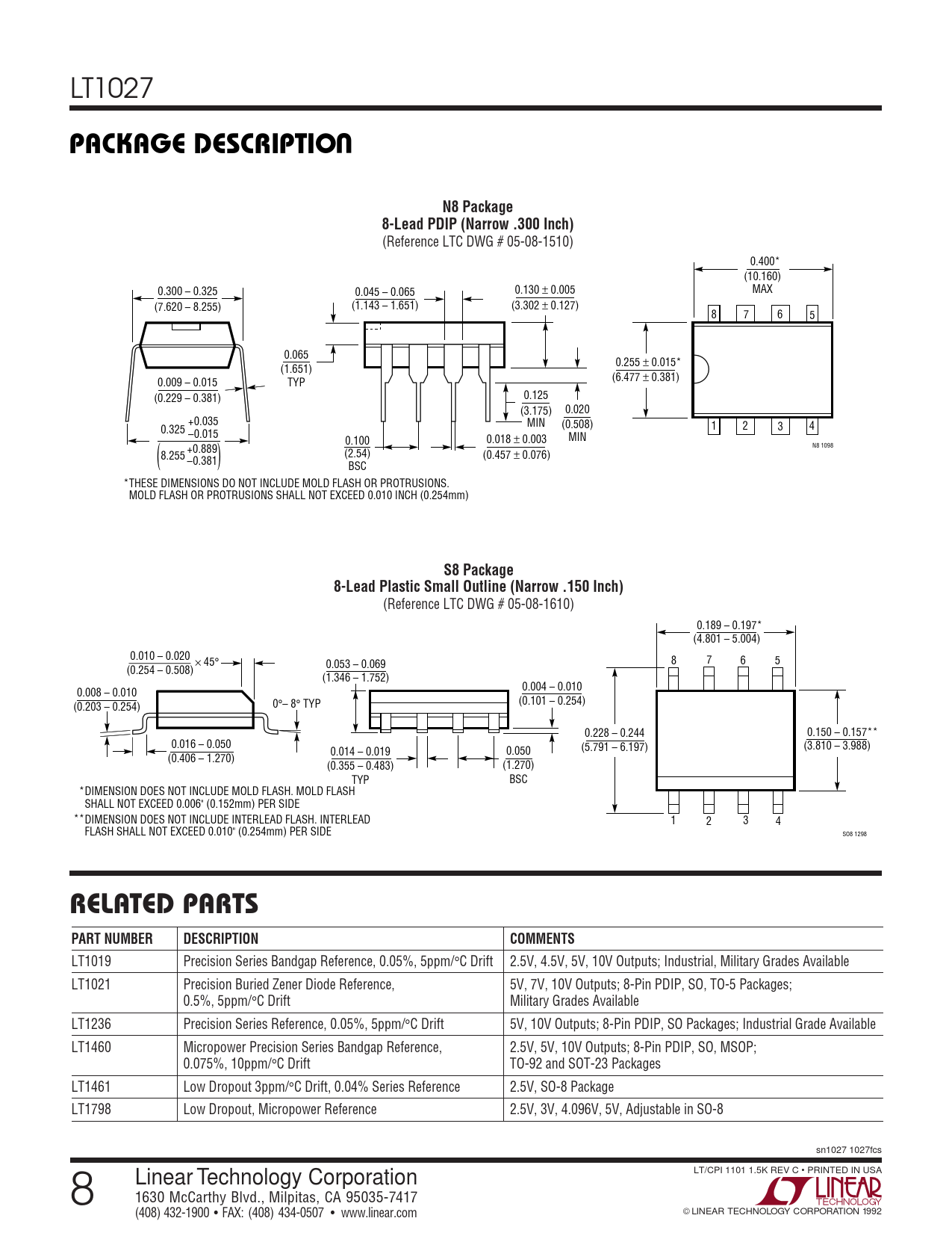LT1019 Precision Series Bandgap Reference, 0.05%, 5ppm/°C Drift 2.5V, 4.5V, 5V, 10V Outputs; Industrial, Military Grades Available LT1021 Precision Buried Zener Diode Reference, 5V, 7V, 10V Outputs; 8-Pin PDIP, SO, TO-5 Packages; 0.5%, 5ppm/°C Drift Military Grades Available LT1236 Precision Series Reference, 0.05%, 5ppm/°C Drift 5V, 10V Outputs; 8-Pin PDIP, SO Packages; Industrial Grade Available LT1460 Micropower Precision Series Bandgap Reference, 2.5V, 5V, 10V Outputs; 8-Pin PDIP, SO, MSOP; 0.075%, 10ppm/°C Drift TO-92 and SOT-23 Packages LT1461 Low Dropout 3ppm/°C Drift, 0.04% Series Reference 2.5V, SO-8 Package LT1798 Low Dropout, Micropower Reference 2.5V, 3V, 4.096V, 5V, Adjustable in SO-8 sn1027 1027fcs LT/CPI 1101 1.5K REV C • PRINTED IN USA 8 Linear Technology Corporation 1630 McCarthy Blvd., Milpitas, CA 95035-7417 LINEAR TECHNOLOGY CORPORATION 1992 (408) 432-1900 ● FAX: (408) 434-0507 ● www.linear.com