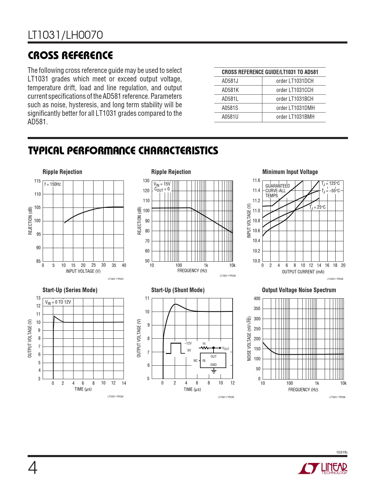 LT1031/LH0070 UCROSS REFERENCE The following cross reference guide may be used to select CROSS REFERENCE GUIDE/LT1031 TO AD581 LT1031 grades which meet or exceed output voltage, AD581J order LT1031DCH temperature drift, load and line regulation, and output AD581K order LT1031CCH current specifications of the AD581 reference. Parameters AD581L order LT1031BCH such as noise, hysteresis, and long term stability will be A0581S order LT1031DMH significantly better for all LT1031 grades compared to the A0581U order LT1031BMH AD581. WUTYPICAL PERFOR A CE CHARACTERISTICSRipple RejectionRipple RejectionMinimum Input Voltage 115 130 11.6 f = 150Hz V T IN = 15V GUARANTEED J = 125°C 120 COUT = 0 11.4 CURVE-ALL T 110 J = –55°C TEMPS 110 11.2 105 TJ = 25°C 100 11.0 100 90 10.8 80 10.6 REJECTION (dB) 95 REJECTION (dB) INPUT VOLTAGE (V) 70 10.4 90 60 10.2 85 50 10.0 0 5 10 15 20 25 30 35 40 10 100 1k 10k 0 2 4 6 8 10 12 14 16 18 20 INPUT VOLTAGE (V) FREQUENCY (Hz) OUTPUT CURRENT (mA) LT1031 • TPC02 LT1031 • TPC01 LT1031 • TPC03 Start-Up (Series Mode)Start-Up (Shunt Mode)Output Voltage Noise Spectrum 13 11 400 VIN = 0 TO 12V 12 350 10 11 10 √Hz) 300 9 9 250 8 8 200 –12V 1k 7 VOUT 150 7 0V OUTPUT VOLTAGE (V) 6 OUTPUT VOLTAGE (V) OUT NC IN NOISE VOLTAGE (nV/ 100 5 6 GND 4 50 3 5 0 0 2 4 6 8 10 12 14 0 2 4 6 8 10 12 10 100 1k 10k TIME (µs) TIME (µs) FREQUENCY (Hz) LT1031 • TPC04 LT1031 • TPC05 LT1031 • TPC06 1031fb 4