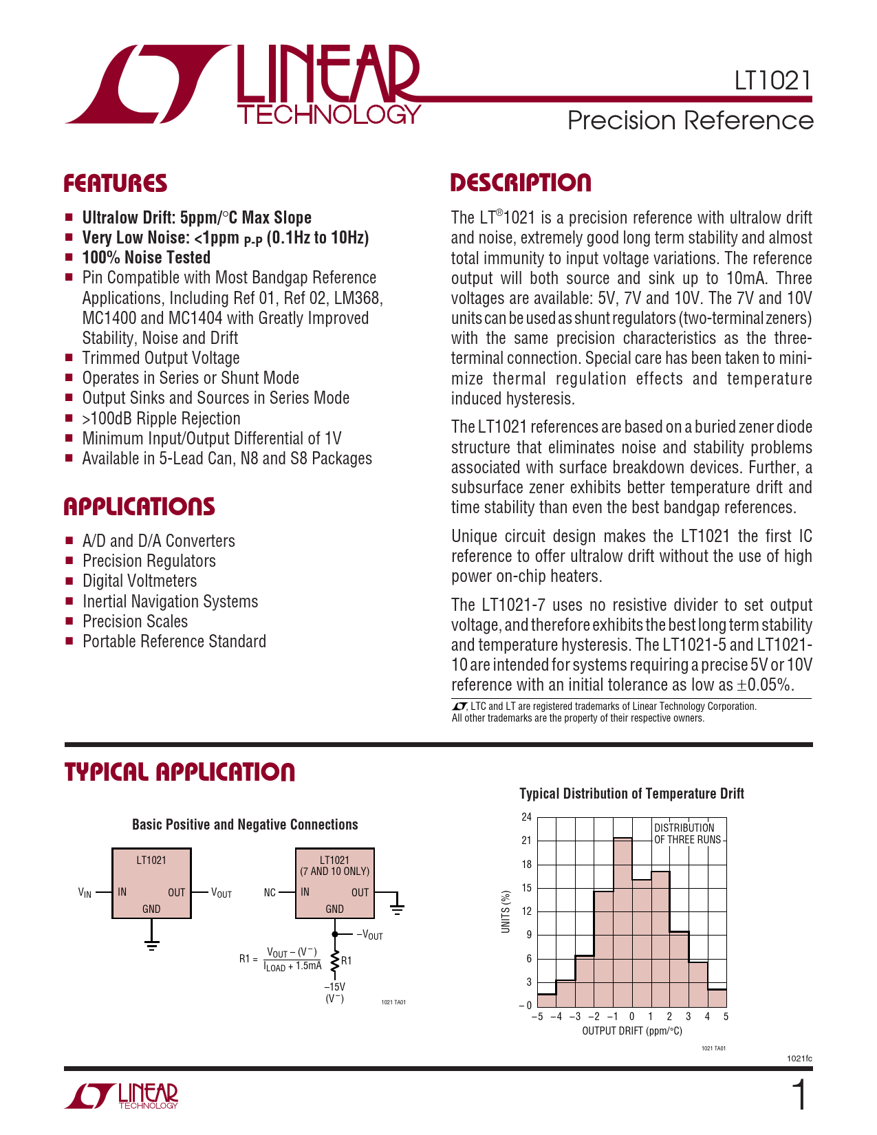 LT1021 Precision Reference UFEATURESDESCRIPTIO ■ Ultralow Drift: 5ppm/ ° C Max Slope The LT®1021 is a precision reference with ultralow drift ■ Very Low Noise: <1ppm P-P (0.1Hz to 10Hz) and noise, extremely good long term stability and almost ■ 100% Noise Tested total immunity to input voltage variations. The reference ■ Pin Compatible with Most Bandgap Reference output will both source and sink up to 10mA. Three Applications, Including Ref 01, Ref 02, LM368, voltages are available: 5V, 7V and 10V. The 7V and 10V MC1400 and MC1404 with Greatly Improved units can be used as shunt regulators (two-terminal zeners) Stability, Noise and Drift with the same precision characteristics as the three- ■ Trimmed Output Voltage terminal connection. Special care has been taken to mini- ■ Operates in Series or Shunt Mode mize thermal regulation effects and temperature ■ Output Sinks and Sources in Series Mode induced hysteresis. ■ >100dB Ripple Rejection The LT1021 references are based on a buried zener diode ■ Minimum Input/Output Differential of 1V structure that eliminates noise and stability problems ■ Available in 5-Lead Can, N8 and S8 Packages associated with surface breakdown devices. Further, a U subsurface zener exhibits better temperature drift and APPLICATIO S time stability than even the best bandgap references. ■ A/D and D/A Converters Unique circuit design makes the LT1021 the first IC ■ Precision Regulators reference to offer ultralow drift without the use of high ■ Digital Voltmeters power on-chip heaters. ■ Inertial Navigation Systems The LT1021-7 uses no resistive divider to set output ■ Precision Scales voltage, and therefore exhibits the best long term stability ■ Portable Reference Standard and temperature hysteresis. The LT1021-5 and LT1021- 10 are intended for systems requiring a precise 5V or 10V reference with an initial tolerance as low as ±0.05%. , LTC and LT are registered trademarks of Linear Technology Corporation. All other trademarks are the property of their respective owners. UTYPICAL APPLICATIOTypical Distribution of Temperature Drift 24 Basic Positive and Negative Connections DISTRIBUTION 21 OF THREE RUNS LT1021 LT1021 18 (7 AND 10 ONLY) 15 V IN IN OUT V NC IN OUT OUT GND GND 12 UNITS (%) –VOUT 9 V R1 = OUT – (V – ) 6 I R1 LOAD + 1.5mA 3 –15V (V –) 1021 TA01 – 0 – 5 – 4 – 3 – 2 –1 0 1 2 3 4 5 OUTPUT DRIFT (ppm/°C) 1021 TA01 1021fc 1
