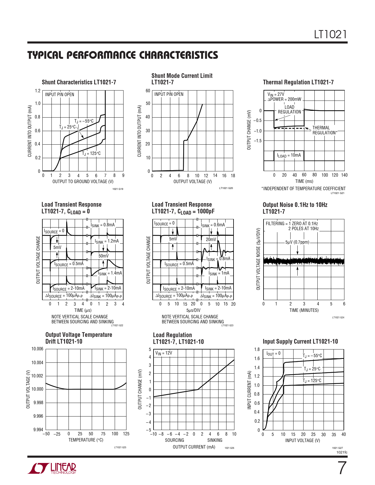 W U TYPICAL PERFOR A CE CH C ARA TERISTICS Shunt Mode Current Limit Shunt Characteristics LT1021-7 LT1021-7 Thermal Regulation LT1021-7
