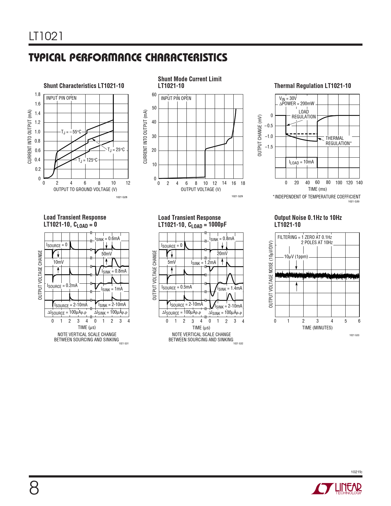 I FILTERING = 1 ZERO AT 0.1Hz SINK = 0.6mA ISINK = 0.8mA 2 POLES AT 10Hz ISOURCE = 0 ISOURCE = 0 50mV 20mV µV/DIV) 10µV (1ppm) 10mV 5mV ISINK = 1.2mA ISINK = 0.8mA ISOURCE = 0.2mA I ISOURCE = 0.5mA SINK = 1mA ISINK = 1.4mA OUTPUT VOLTAGE CHANGE OUTPUT VOLTAGE CHANGE ISOURCE = 2-10mA ISINK = 2-10mA ISOURCE = 2-10mA ISINK = 2-10mA OUTPUT VOLTAGE NOISE (10 ∆ISOURCE = 100µAP-P ∆ISINK = 100µAP-P ∆ISOURCE = 100µAP-P ∆ISINK = 100µAP-P 0 1 2 3 4 0 1 2 3 4 0 1 2 3 4 0 1 2 3 4 0 1 2 3 4 5 6 TIME (µs) TIME (µs) TIME (MINUTES) NOTE VERTICAL SCALE CHANGE NOTE VERTICAL SCALE CHANGE 1021 G33 BETWEEN SOURCING AND SINKING BETWEEN SOURCING AND SINKING 1021 G31 1021 G32 1021fc 8