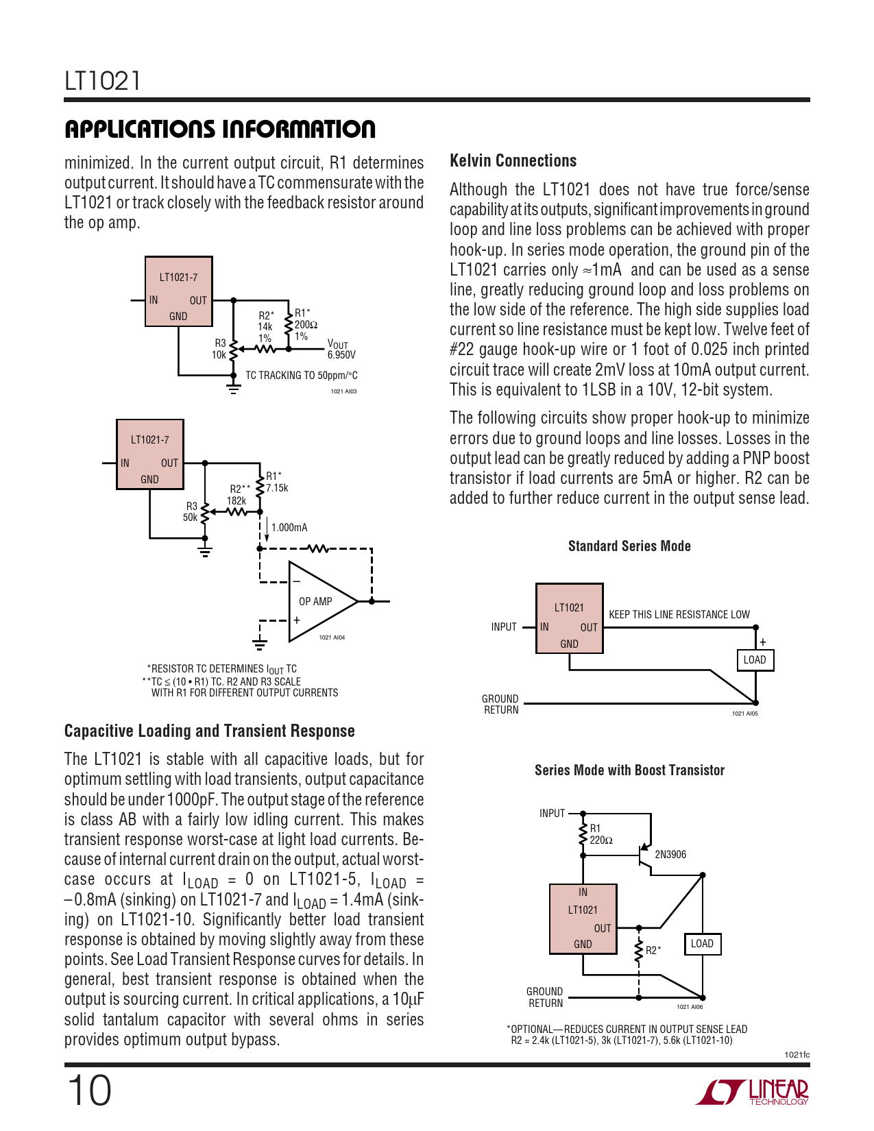 optimum settling with load transients, output capacitance should be under 1000pF. The output stage of the reference is class AB with a fairly low idling current. This makes INPUT R1 transient response worst-case at light load currents. Be- 220Ω cause of internal current drain on the output, actual worst- 2N3906 case occurs at ILOAD = 0 on LT1021-5, ILOAD = – 0.8mA (sinking) on LT1021-7 and I IN LOAD = 1.4mA (sink- LT1021 ing) on LT1021-10. Significantly better load transient OUT response is obtained by moving slightly away from these GND LOAD R2* points. See Load Transient Response curves for details. In general, best transient response is obtained when the output is sourcing current. In critical applications, a 10µF GROUND RETURN 1021 AI06 solid tantalum capacitor with several ohms in series *OPTIONAL—REDUCES CURRENT IN OUTPUT SENSE LEAD provides optimum output bypass. R2 = 2.4k (LT1021-5), 3k (LT1021-7), 5.6k (LT1021-10) 1021fc 10