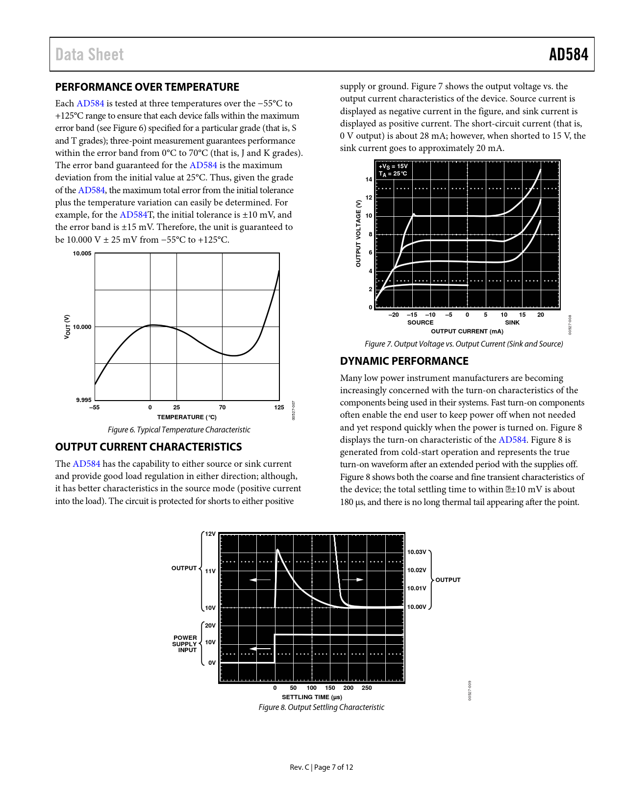 Data Sheet AD584 PERFORMANCE OVER TEMPERATURE +VS = 15V TA = 25°C ) 12 V ( GE 10 OLTA T V U 10.005 –20 –15 –10 (V) SOURCE SINK 10.000