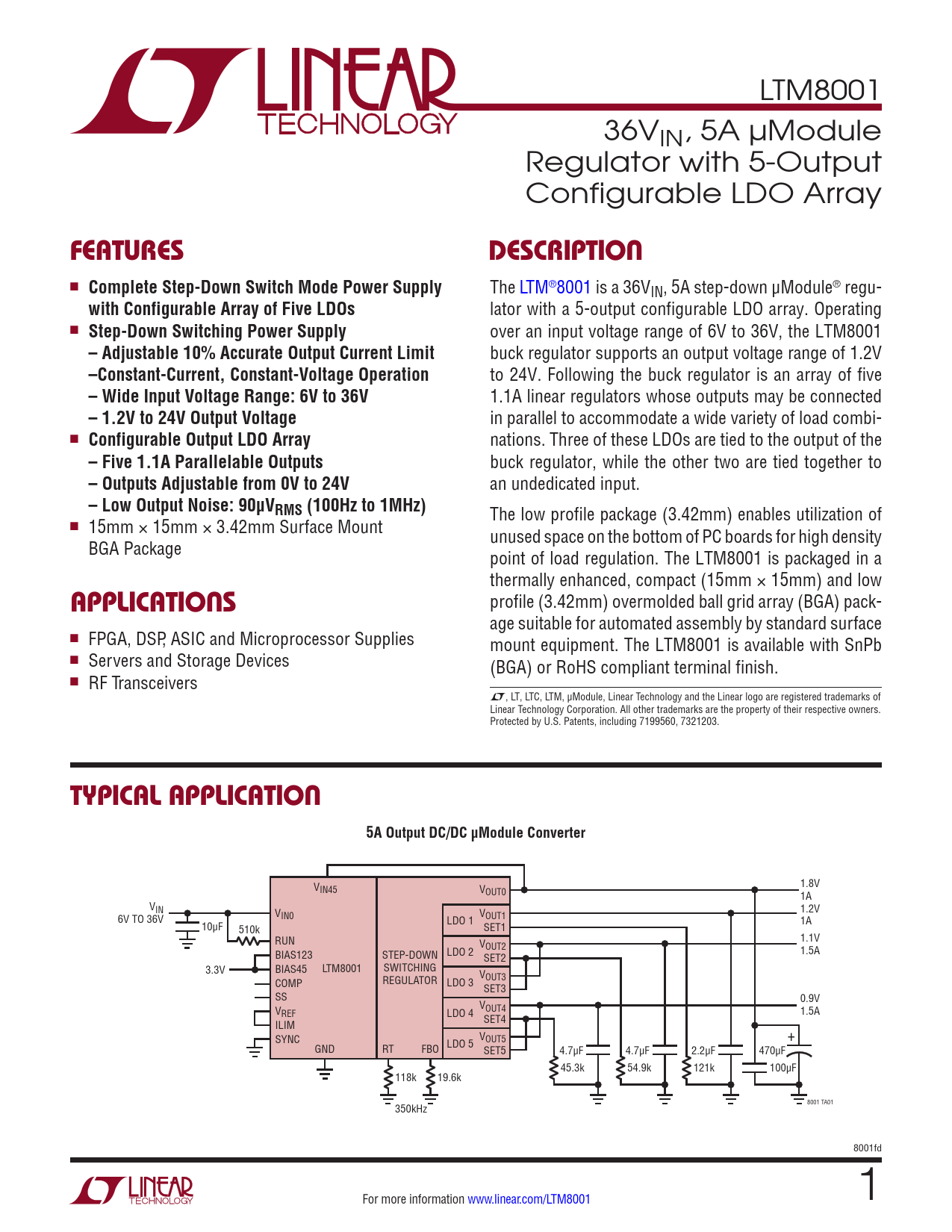 profile (3.42mm) overmolded ball grid array (BGA) pack- age suitable for automated assembly by standard surface n FPGA, DSP, ASIC and Microprocessor Supplies mount equipment. The LTM8001 is available with SnPb n Servers and Storage Devices (BGA) or RoHS compliant terminal finish. n RF Transceivers L, LT, LTC, LTM, µModule, Linear Technology and the Linear logo are registered trademarks of Linear Technology Corporation. All other trademarks are the property of their respective owners. Protected by U.S. Patents, including 7199560, 7321203.
