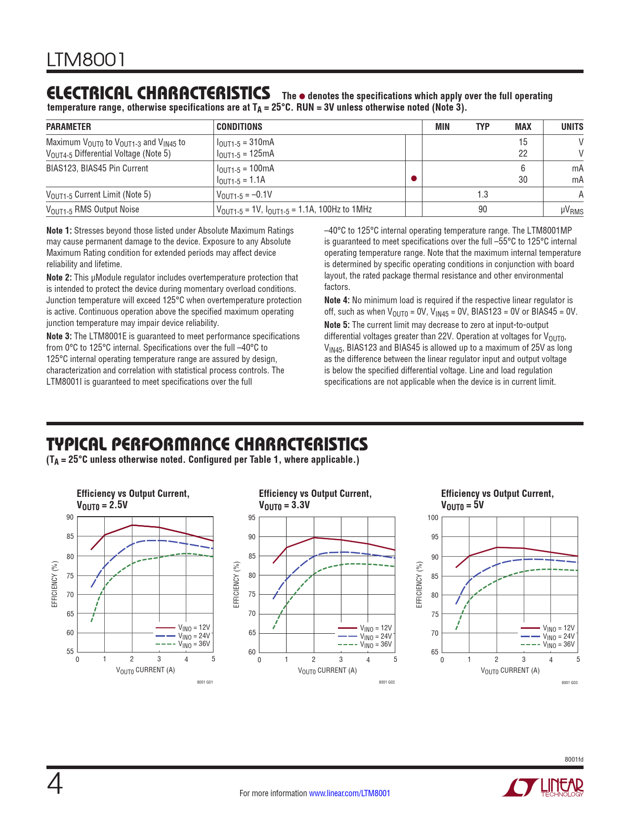 The LTM8001E is guaranteed to meet performance specifications differential voltages greater than 22V. Operation at voltages for VOUT0, from 0°C to 125°C internal. Specifications over the full –40°C to VIN45, BIAS123 and BIAS45 is allowed up to a maximum of 25V as long 125°C internal operating temperature range are assured by design, as the difference between the linear regulator input and output voltage characterization and correlation with statistical process controls. The is below the specified differential voltage. Line and load regulation LTM8001I is guaranteed to meet specifications over the full specifications are not applicable when the device is in current limit.