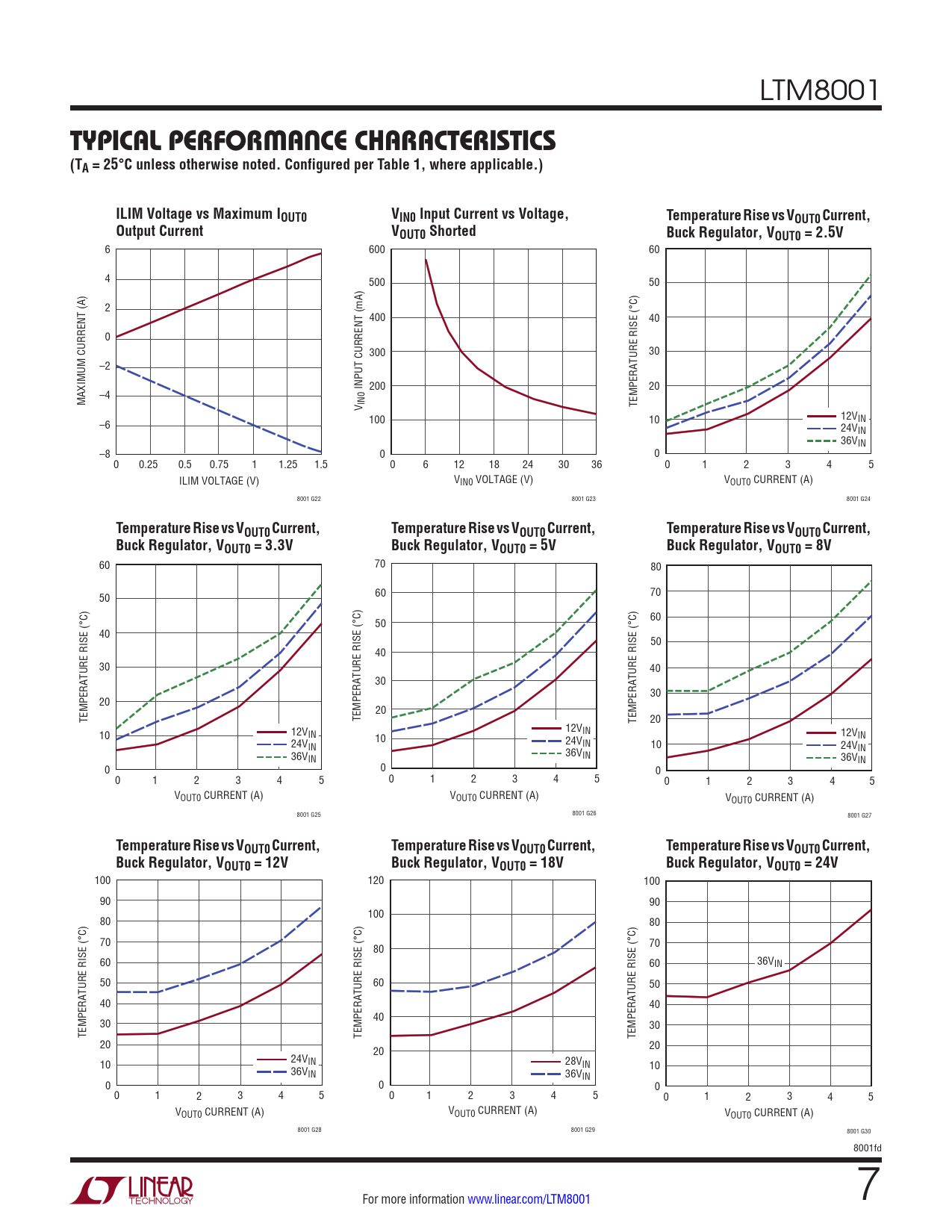 6 600 60 4 500 50 2 400 40 0 300 30 –2 INPUT CURRENT (mA) 200 20 –4 MAXIMUM CURRENT (A) V IN0 TEMPERATURE RISE (°C) 12V –6 100 10 IN 24VIN 36VIN –8 0 0 0 0.25 0.5 0.75 1 1.25 1.5 0 6 12 18 24 30 36 0 1 2 3 4 5 ILIM VOLTAGE (V) VIN0 VOLTAGE (V) VOUT0 CURRENT (A) 8001 G22 8001 G23 8001 G24