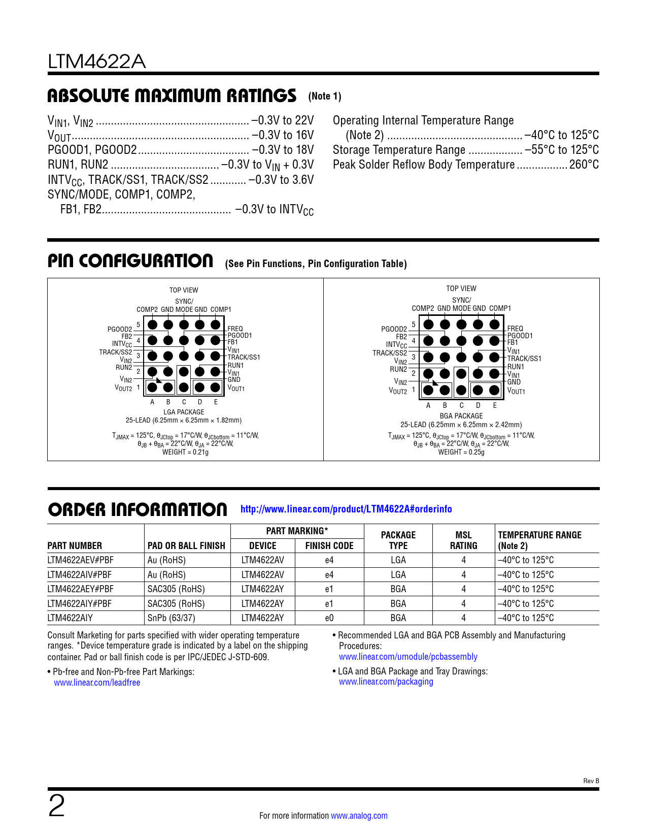 ORDER INFORMATION http://www.linear.com/product/LTM4622A#orderinfo PART MARKING* PACKAGE MSL TEMPERATURE RANGE PART NUMBER PAD OR BALL FINISH DEVICE FINISH CODE TYPE RATING (Note 2)