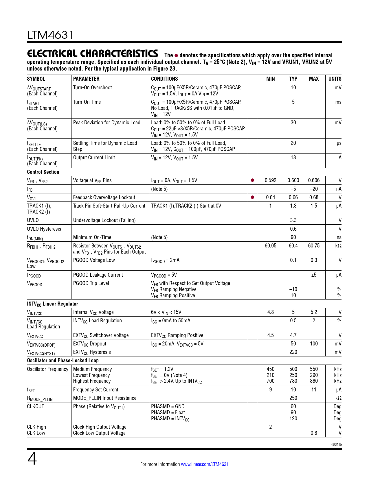 Oscillator Frequency Medium Frequency fSET = 1.2V 450 500 550 kHz Lowest Frequency fSET = 0V (Note 4) 210 250 290 kHz Highest Frequency fSET > 2.4V, Up to INTVCC 700 780 860 kHz fSET Frequency Set Current 9 10 11 µA RMODE_PLLIN MODE_PLLIN Input Resistance 250 kΩ CLKOUT Phase (Relative to VOUT1) PHASMD = GND 60 Deg PHASMD = Float 90 Deg PHASMD = INTVCC 120 Deg CLK High Clock High Output Voltage 2 V CLK Low Clock Low Output Voltage 0.8 V 4631fb 4 For more information www.linear.com/LTM4631 Document Outline Description Typical Application Absolute Maximum Ratings Pin Configuration Electrical Characteristics Typical Performance Characteristics Pin Functions Operation Applications Information Package Description Related Parts Features Applications Typical Application Description Absolute Maximum Ratings Pin Configuration Order Information Electrical Characteristics Typical Performance Characteristics Pin Functions Simplified Block Diagram Decoupling Requirements Operation Applications Information typical Applications Package Description Revision History Package PHoto Design Resources Related Parts