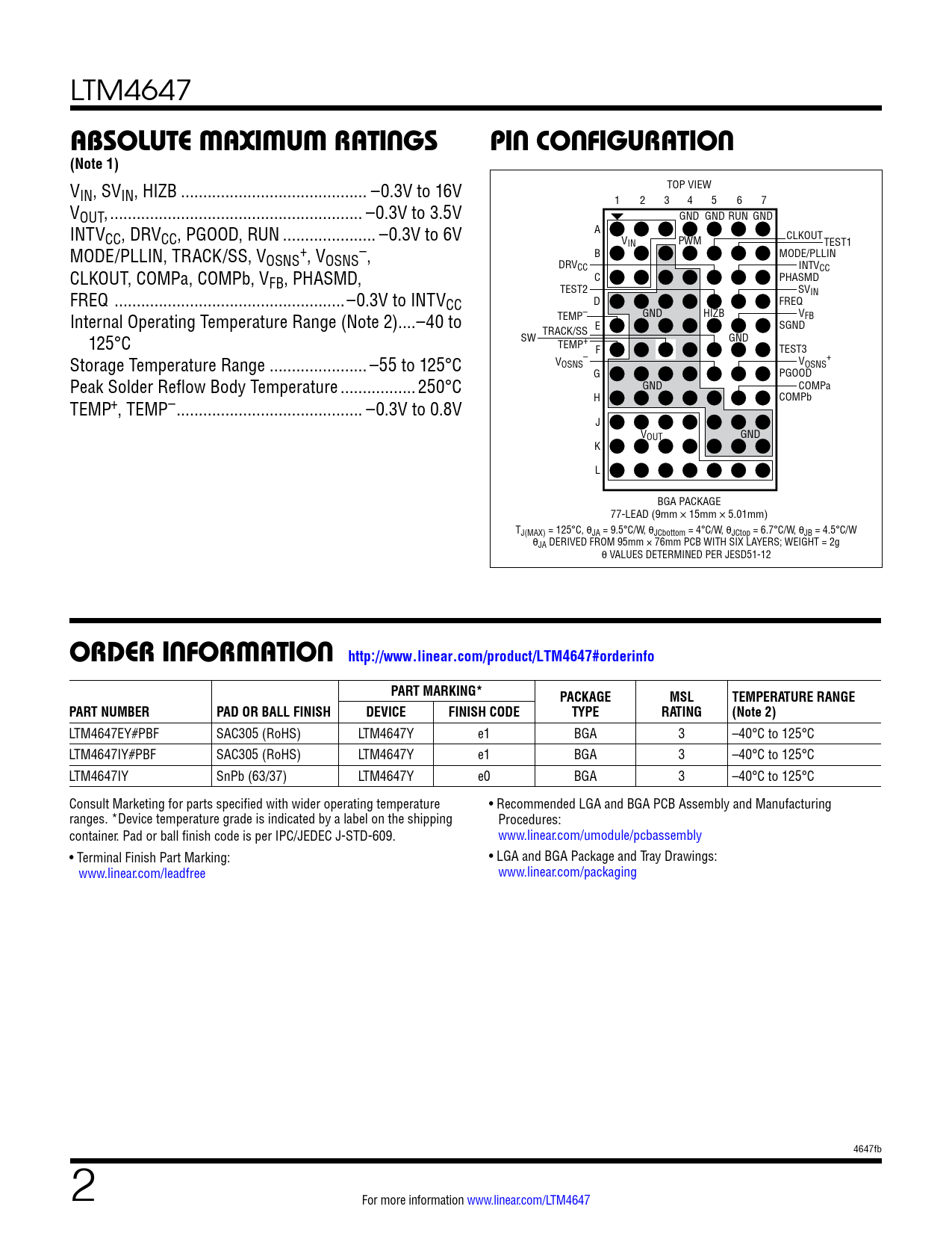 LTM4647 ABSOLUTE MAXIMUM RATINGSPIN CONFIGURATION(Note 1) V TOP VIEW IN, SVIN, HIZB .. –0.3V to 16V 1 2 3 4 5 6 7 VOUT, ... –0.3V to 3.5V GND GND RUN GND INTV A CC, DRVCC, PGOOD, RUN ... –0.3V to 6V VIN PWM CLKOUTTEST1 MODE/PLLIN, TRACK/SS, V + – OSNS , VOSNS , B MODE/PLLIN DRV INTV CLKOUT, COMPa, COMPb, V CC CC FB, PHASMD, C PHASMD FREQ ..–0.3V to INTV TEST2 SVIN CC D FREQ Internal Operating Temperature Range (Note 2) ..–40 to GND HIZB V TEMP– FB E SGND TRACK/SS 125°C SW GND TEMP+ F TEST3 Storage Temperature Range .. –55 to 125°C V – OSNS V + OSNS G PGOOD Peak Solder Reflow Body Temperature ... 250°C GND COMPa TEMP+, TEMP– .. –0.3V to 0.8V H COMPb J VOUT GND K L BGA PACKAGE 77-LEAD (9mm × 15mm × 5.01mm) TJ(MAX) = 125°C, θJA = 9.5°C/W, θJCbottom = 4°C/W, θJCtop = 6.7°C/W, θJB = 4.5°C/W θJA DERIVED FROM 95mm × 76mm PCB WITH SIX LAYERS; WEIGHT = 2g θ VALUES DETERMINED PER JESD51-12 ORDER INFORMATION http://www.linear.com/product/LTM4647#orderinfoPART MARKING*PACKAGEMSLTEMPERATURE RANGEPART NUMBERPAD OR BALL FINISHDEVICEFINISH CODETYPERATING(Note 2) LTM4647EY#PBF SAC305 (RoHS) LTM4647Y e1 BGA 3 –40°C to 125°C LTM4647IY#PBF SAC305 (RoHS) LTM4647Y e1 BGA 3 –40°C to 125°C LTM4647IY SnPb (63/37) LTM4647Y e0 BGA 3 –40°C to 125°C Consult Marketing for parts specified with wider operating temperature • Recommended LGA and BGA PCB Assembly and Manufacturing ranges. *Device temperature grade is indicated by a label on the shipping Procedures: container. Pad or ball finish code is per IPC/JEDEC J-STD-609. www.linear.com/umodule/pcbassembly • Terminal Finish Part Marking: • LGA and BGA Package and Tray Drawings: www.linear.com/leadfree www.linear.com/packaging 4647fb 2 For more information www.linear.com/LTM4647 Document Outline Features Applications Description Typical Application Absolute Maximum Ratings Pin Configuration Electrical Characteristics Typical Performance Characteristics Pin Functions Block Diagram Decoupling Requirements Operation Applications Information Typical Applications